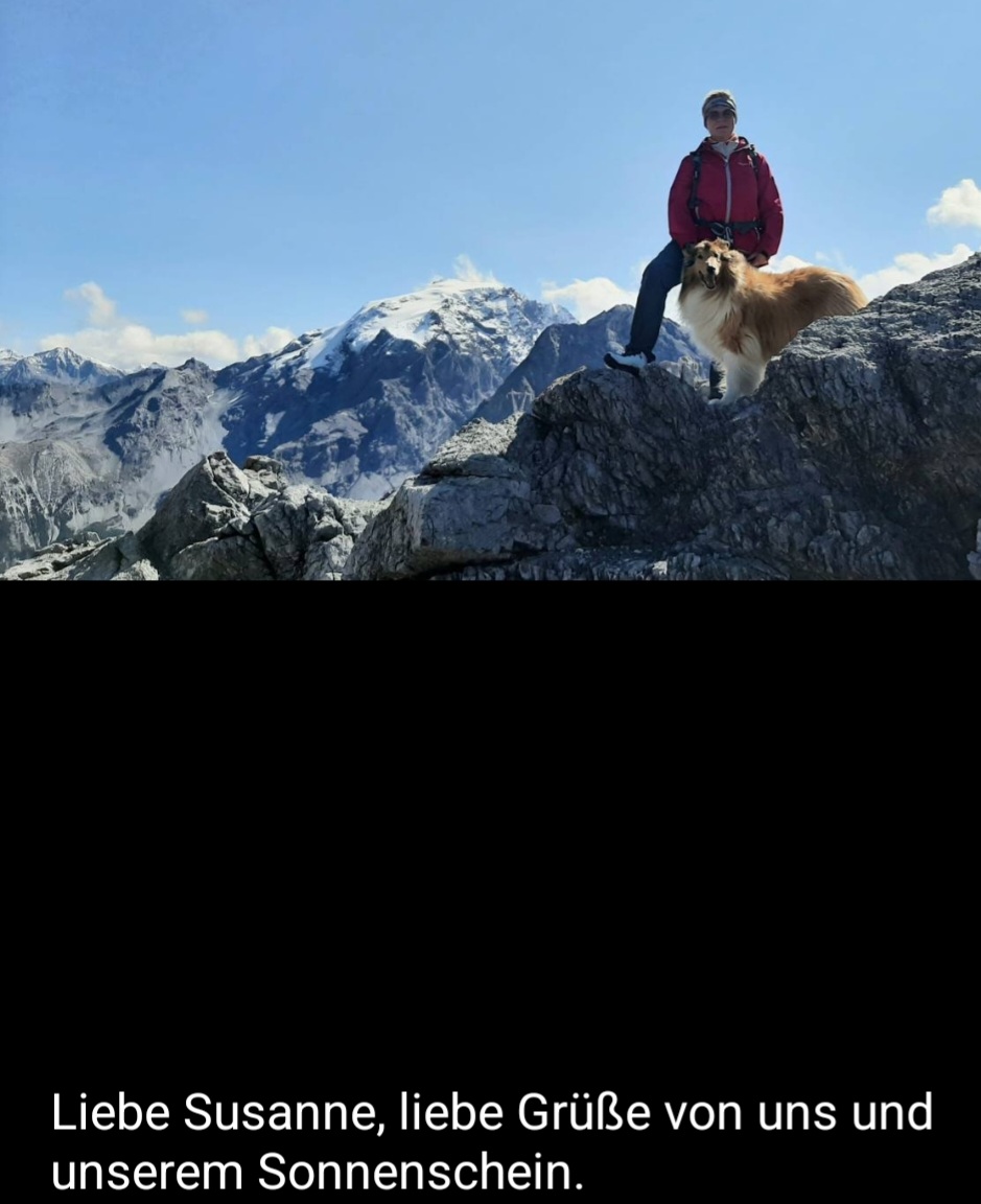 wir sind oft in Gedanken bei euch, auch bei Gernot. Die Erinnerungen an die schönen gemeinsamen Stunden werden nie vergehen. Mit eurem Michl haben wir schon viel Abenteuer erlebt. Gemeinsam mit seiner Meggi sind wir eine richtig gute Colliefamilie. Wir waren diesen Juli mit den Beiden 12 Tage in einem besseren Hotel. Dort war auch Frau A. Merkel schon drei mal gewesen. Es war sehr schön und unsere beiden Fellnasen haben sich vorbildlich benommen.