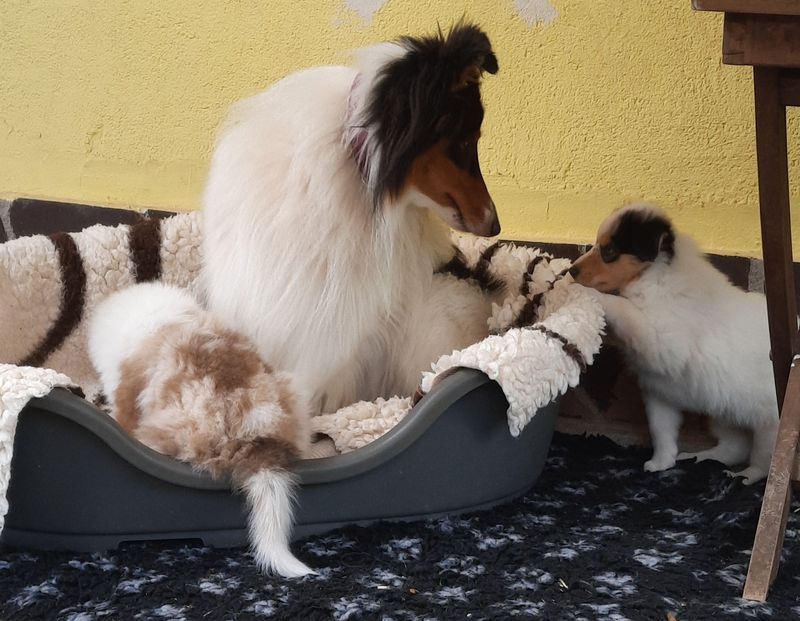 05.01.24 Heute ist auch meine Mina hier komplett in mein besehendes Rudel integriert worden, sie findet es auch völlig normal nicht mehr bei den anderen im Welpengarten zu sein. Das versucht sie mir aber auch schon seid 2 Wochen klar zu machen, aber das ging natürlich nicht so einfach, da ja noch alle da waren. Da aber morgen wieder neue Interesseten für Milan und Mauri kommen, wird es langsam Zeit. Hier zeigen wir euch immer die neuesten Fotos von meiner Mina. 😛
