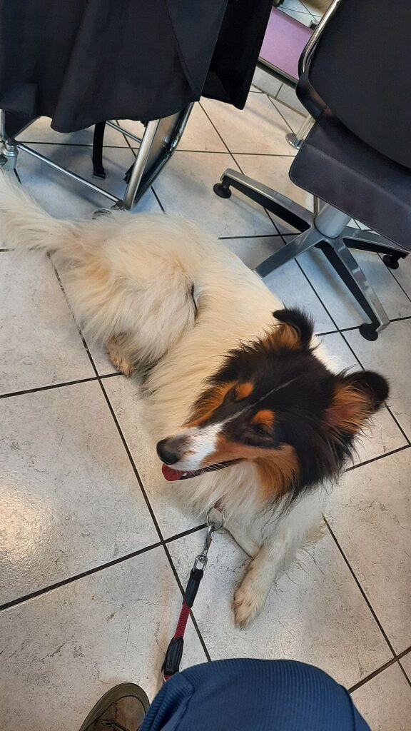 Mina zum 1. körpersprachlichen Longiertraining, Gassi gehen üben an der Leine, und mit Mama und Jana Knochen kauen 😉 Ebenfalls neu Hähnchenhälse langsam fressen üben… auch in der Kita mit Manisha 😛