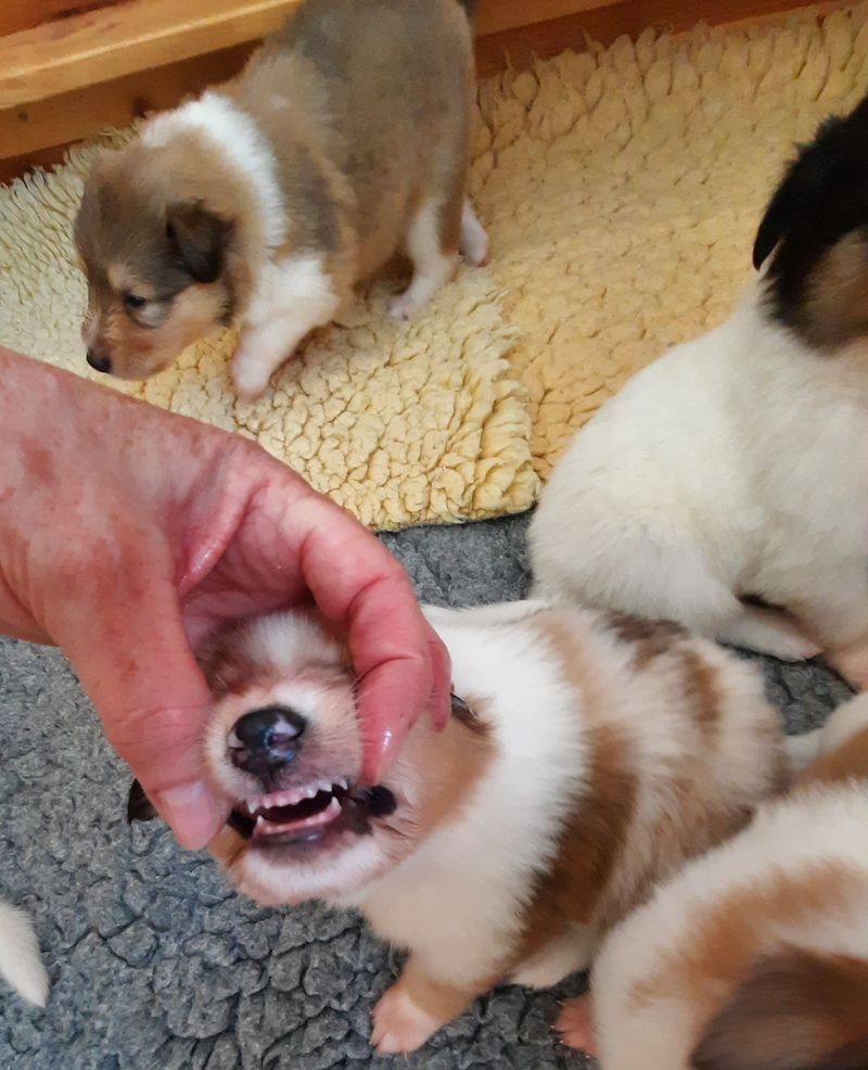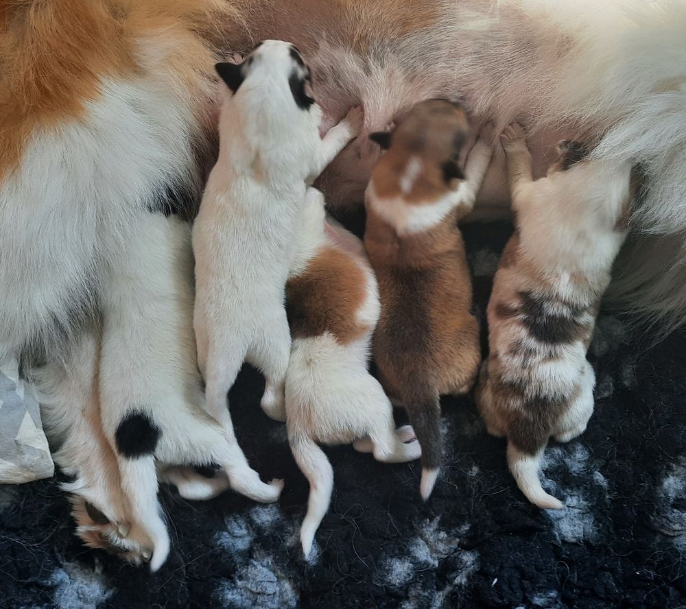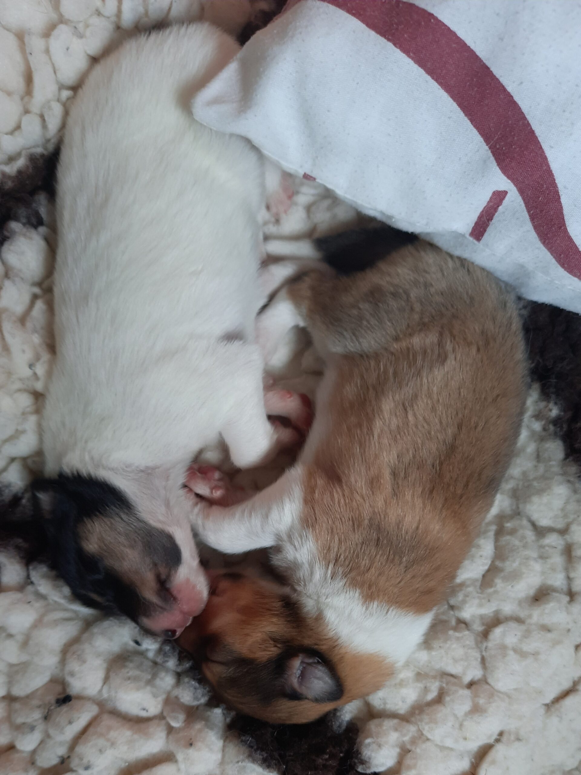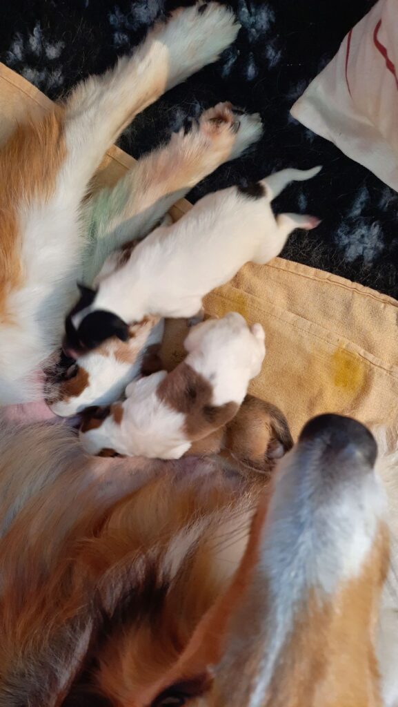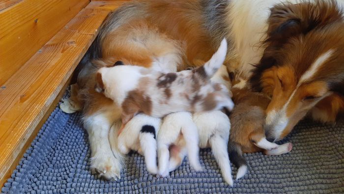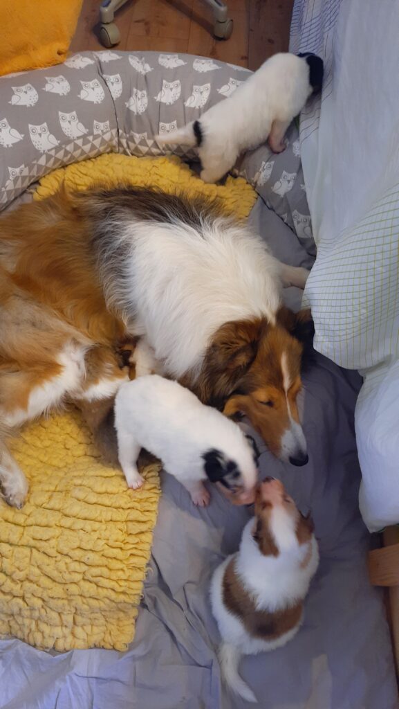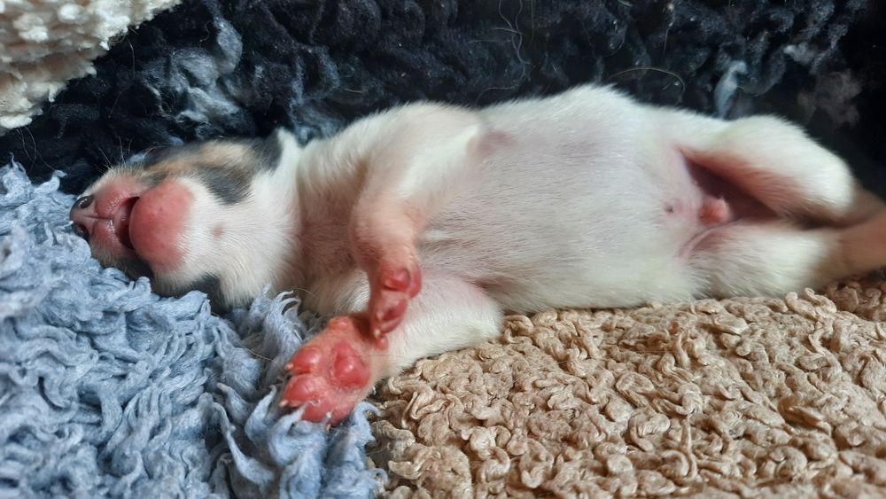 31.08.25 (14 Tage alt, 2 Wochen) Hallihallo hier spricht die Schwerste vom Ochen Clan, wenn wir das so machen, dass immer der oder die Schwerste schreiben dürfen, dann werde ich das wohl hier sein. 😉 🙂 Hi hier ist eure Shuri 😀 Also wir sind ja nun schon in der 3. Woche und vorgestern kamen leider, wie wohl bei allen Lütten, die Würmer ins Spiel, denn obwohl wir Mama bestimmt gefühlt 10 mal gerufen haben und wir die Milchbar leer gesoffen haben, hatten wir abgenomme anscheinend haben die noch MEHR Hunger als wir. Prompt gabs da was in unser Mäulchen und die Nacht war dann etwas uffregend, wegen Bauchweh und so… Mama hat sich dann auch mal für ein paar Stunden eine Auszeit gegönnt, aber Frauli lag ja neben uns und hat unsere Bauchis gestreichelt, wo es grade nötig war. Aber heute morgen hatte die Waage super Gewichte angezeigt, also hat es ja was genutzt. Mama produziert auch ordentlich Milch, wie ihr auf der Seite unter (Welpen O-Wurf) sehen könnt. Dann zeig ich euch jetzt noch schöne Fotos von uns , denn wir haben alle unsere Augen geöffnet und sehen jetzt immer was wir bis jetzt nur riechen und ganz leise hören konnten. Liebe Grüße eure Shuri 🙂