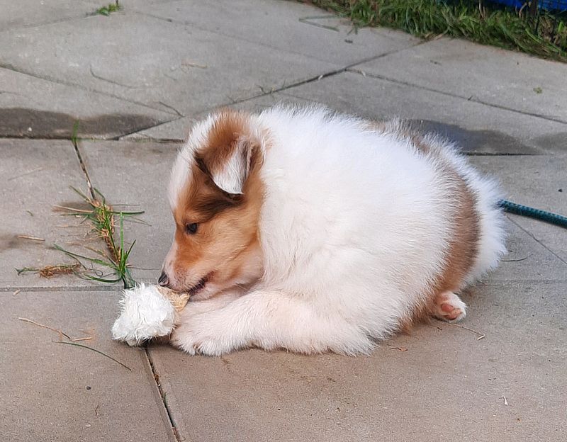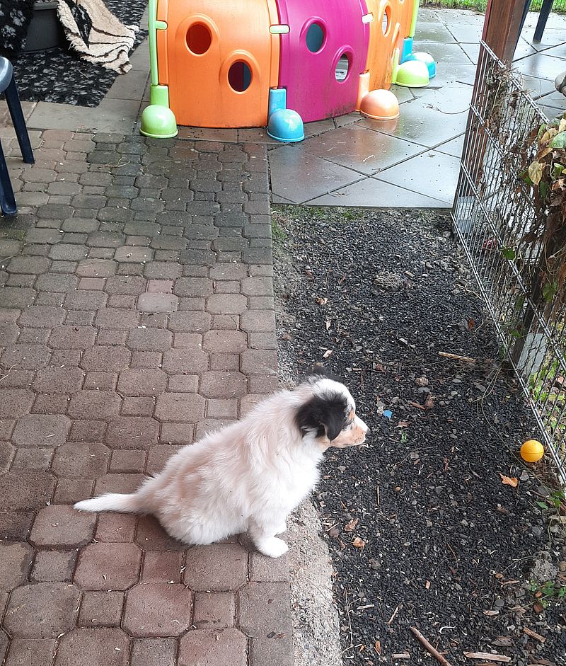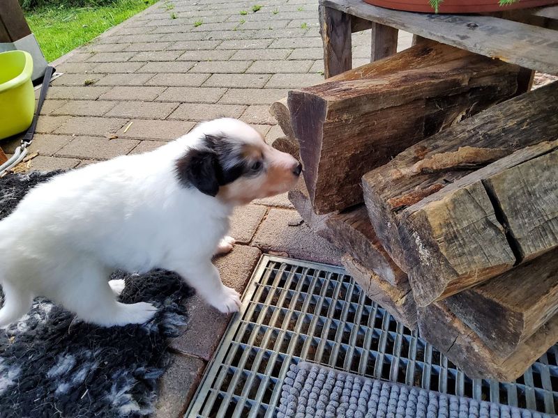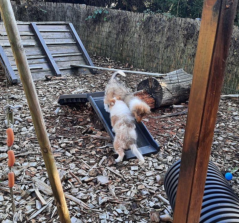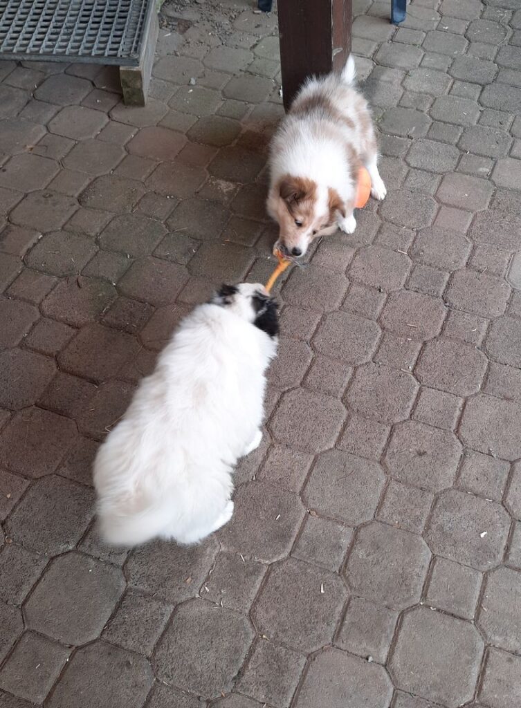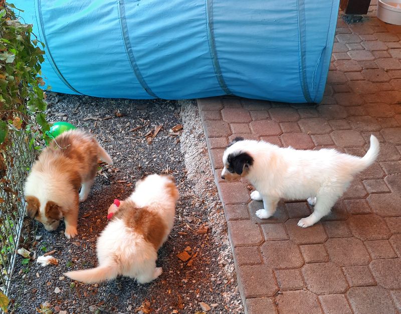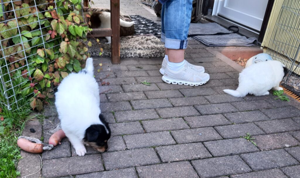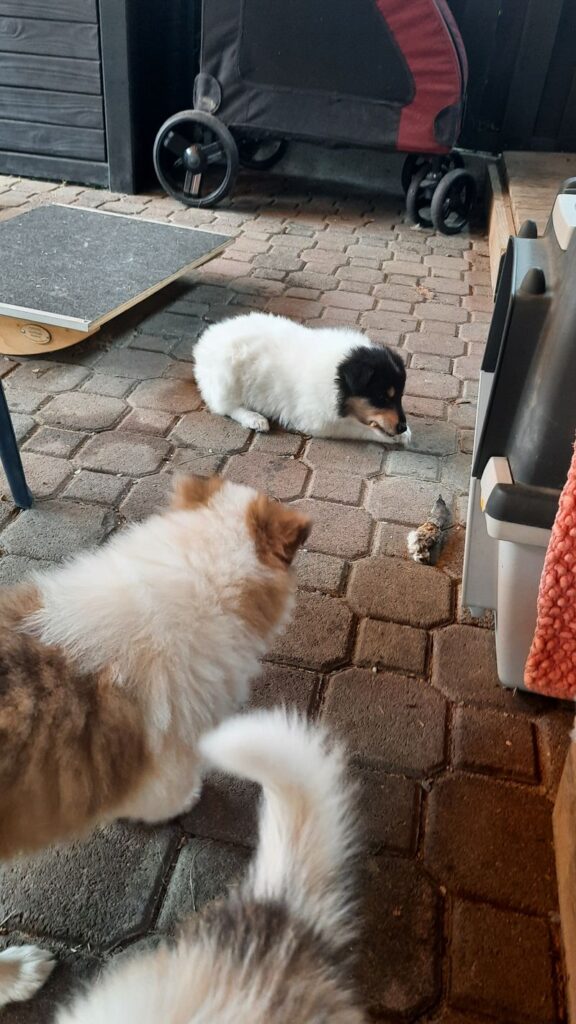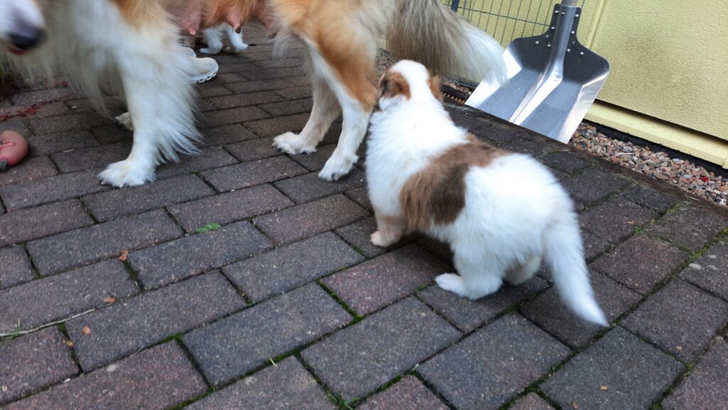 20.09.25 (41 Tage alt, fast 5 Wochen) Was soll ich sagen, … mich kriegt keiner ein 😉 :-P. Also hier kommt Silas, der große Weiße 😀 Wollte euch doch berichten was wir hier alles so durchmachen 😀 Also, den kleinen Garten oben hatten wir ja nun ein paar Tage in Beschlag genommen auch unser Futter inclusive Milchbar gab es draußen. Auch die großen Hunde waren bei uns die süße Linny hat super mit uns gespielt und auch IHREN Knochen geteilt. 🙂 Da war auch viel los, es kamen immer mal wieder neugierige Leute die dann streicheln wollten und so allerlei wissen wollten. Frauli ist ja da, die kann das regeln. aber heute war der Knaller wir sind in den großen Outdoor Garten gekommen. Das ist toll da und ganz viele Knochen gabs und unsere geliebe Geräusche Kiste war auch da. Was will man mehr… naja wenn du so fragst… FUTTER wäre nicht schlecht. 😀