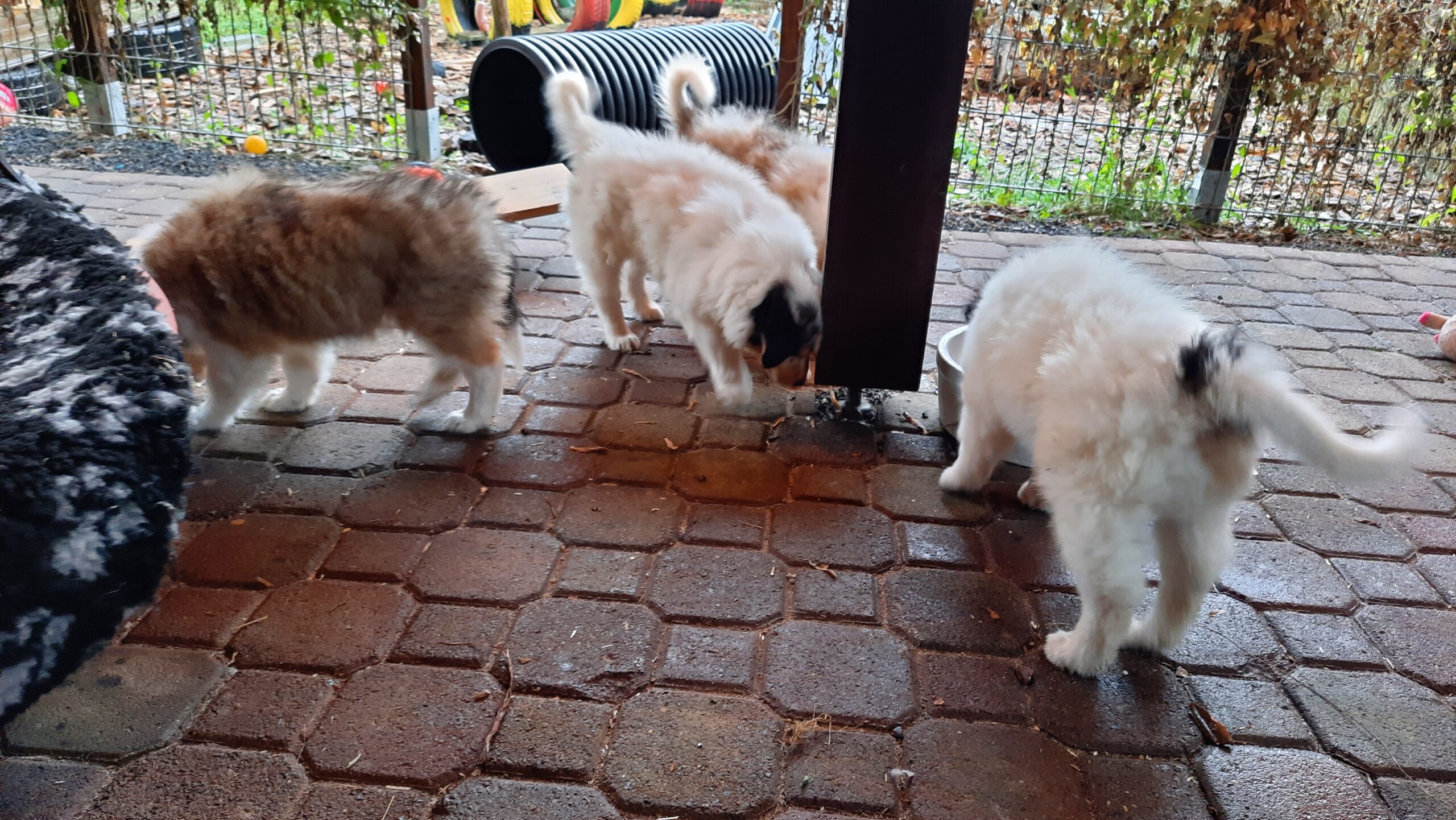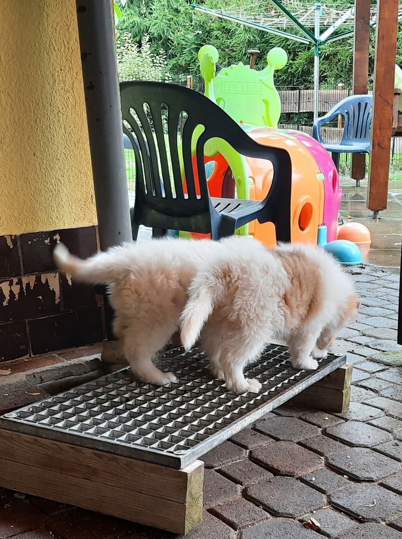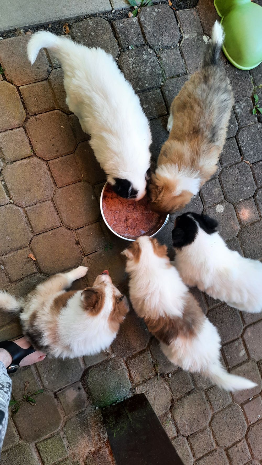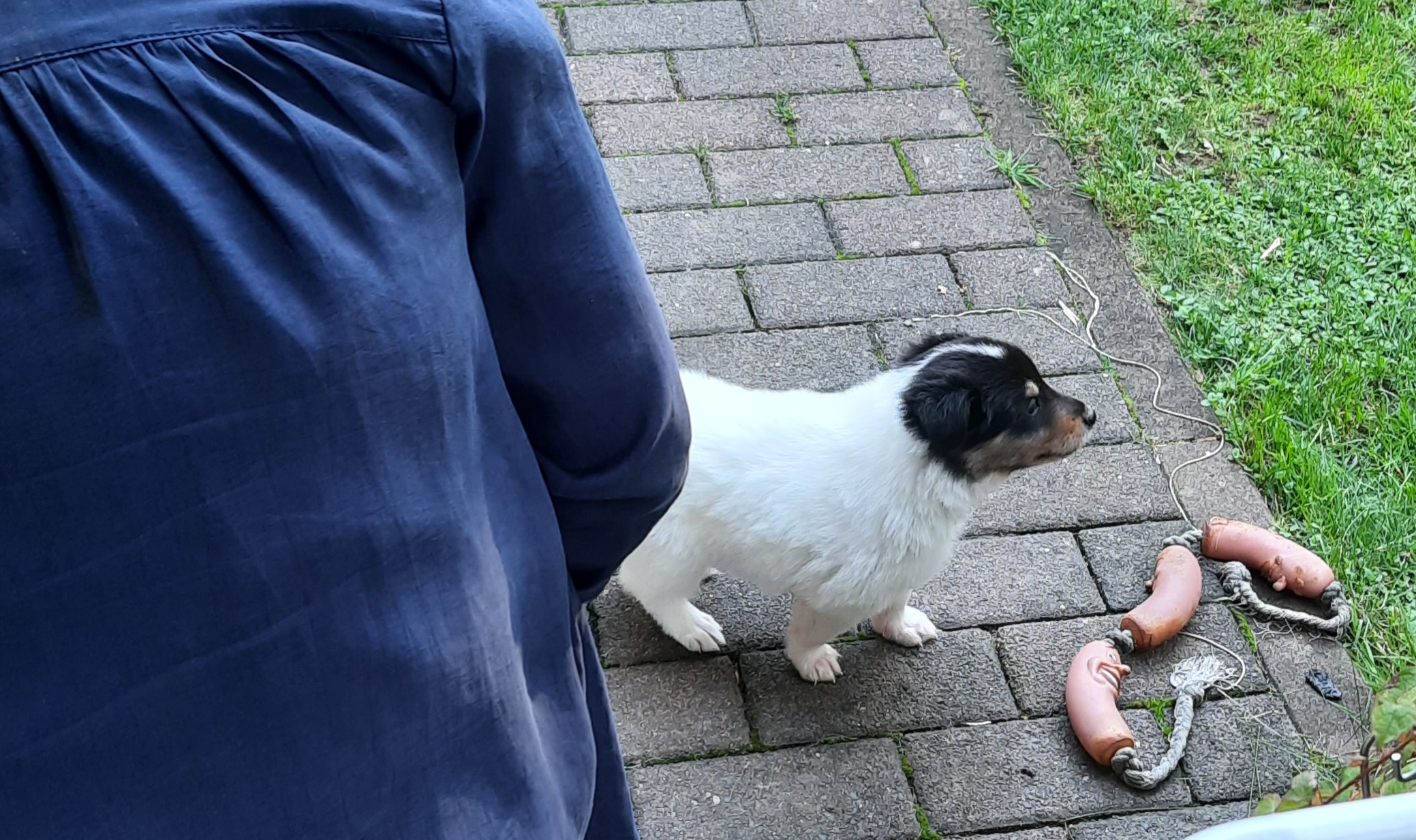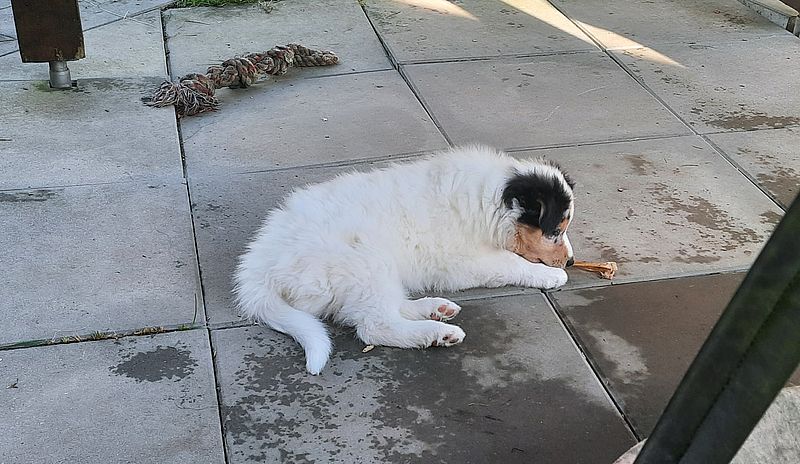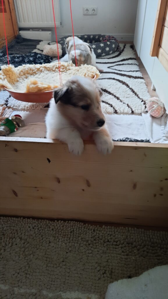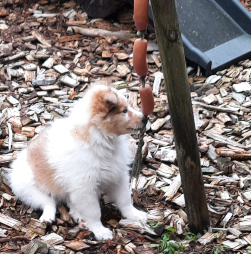 20.09.25 (41 Tage alt, fast 5 Wochen) Was soll ich sagen, … mich kriegt keiner ein 😉 :-P. Also hier kommt Silas, der große Weiße 😀 Wollte euch doch berichten was wir hier alles so durchmachen 😀 Also, den kleinen Garten oben hatten wir ja nun ein paar Tage in Beschlag genommen auch unser Futter inclusive Milchbar gab es draußen. Auch die großen Hunde waren bei uns die süße Linny hat super mit uns gespielt und auch IHREN Knochen geteilt. 🙂 Da war auch viel los, es kamen immer mal wieder neugierige Leute die dann streicheln wollten und so allerlei wissen wollten. Frauli ist ja da, die kann das regeln. aber heute war der Knaller wir sind in den großen Outdoor Garten gekommen. Das ist toll da und ganz viele Knochen gabs und unsere geliebe Geräusche Kiste war auch da. Was will man mehr… naja wenn du so fragst… FUTTER wäre nicht schlecht. 😀