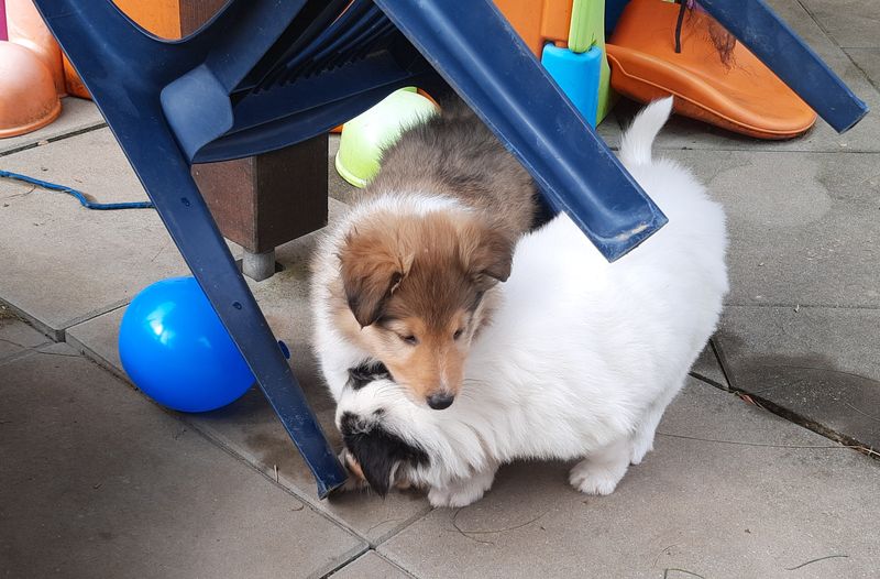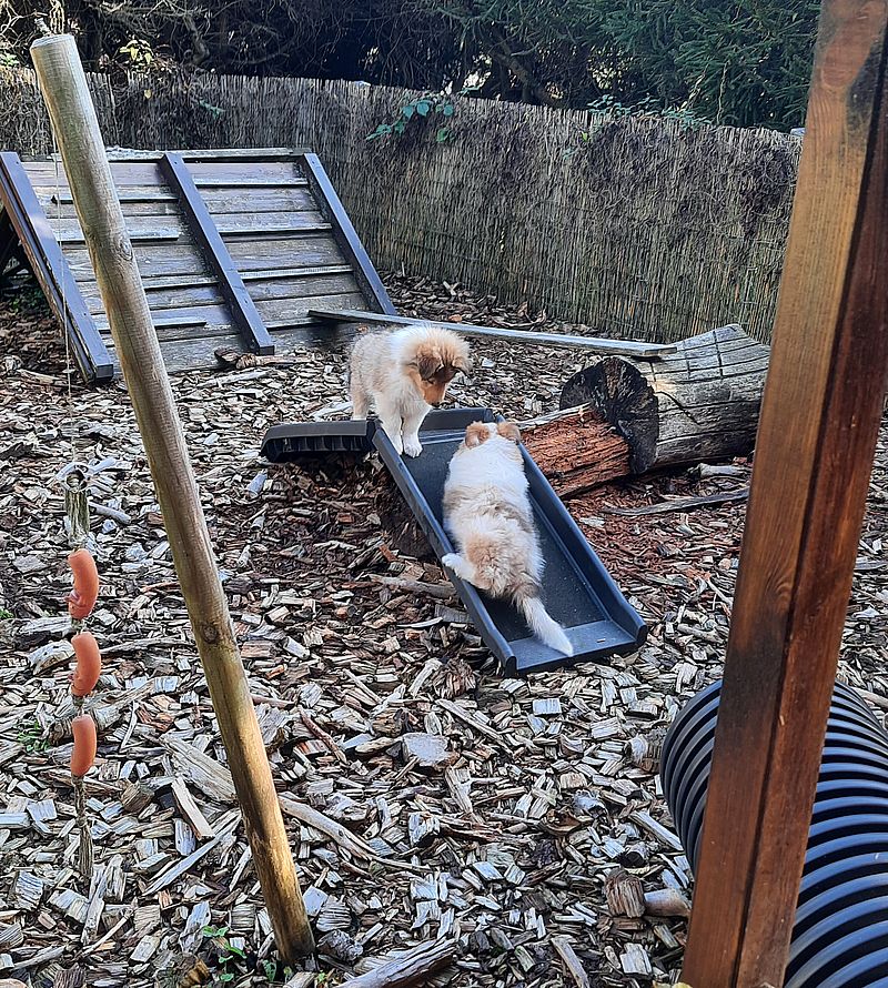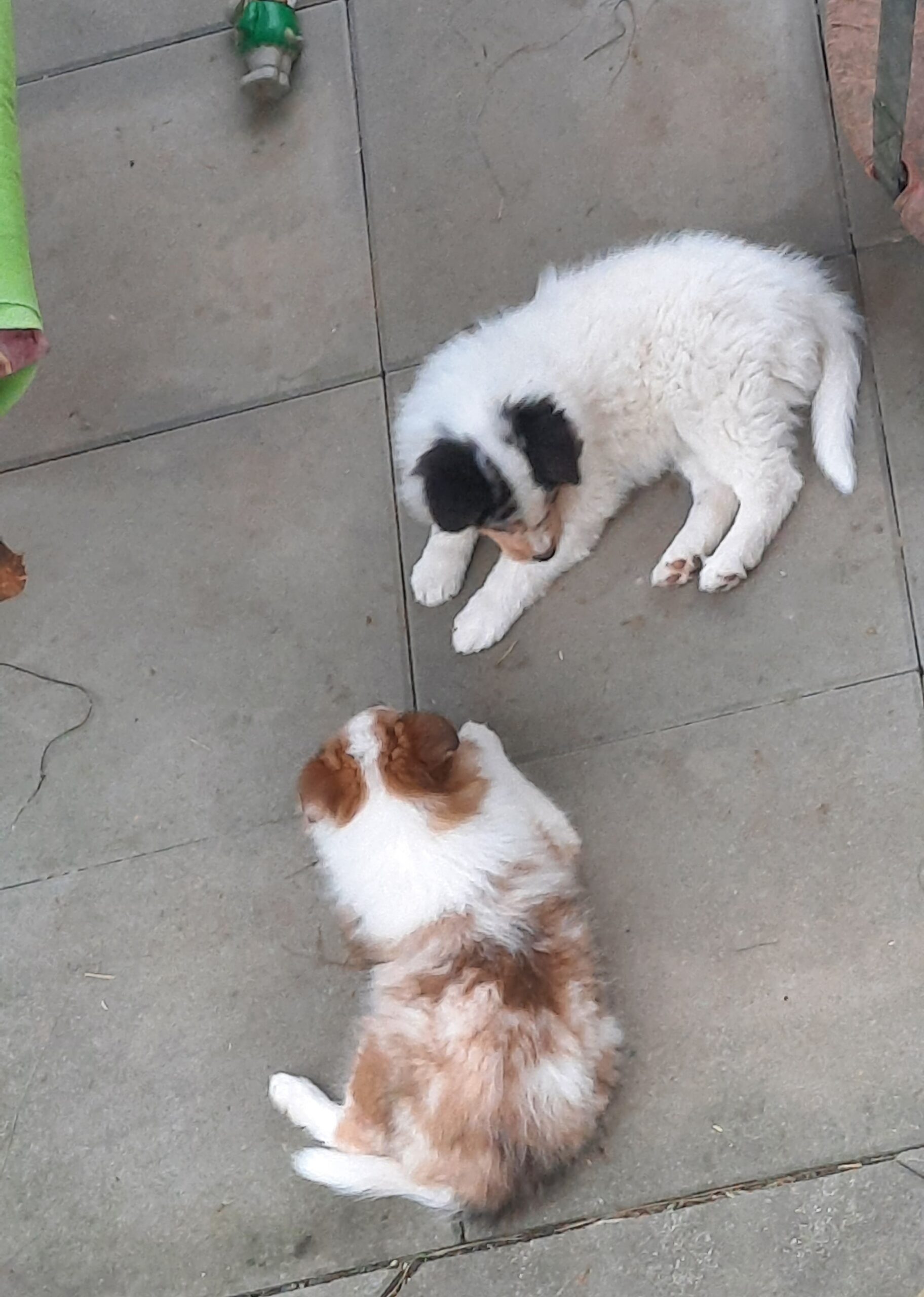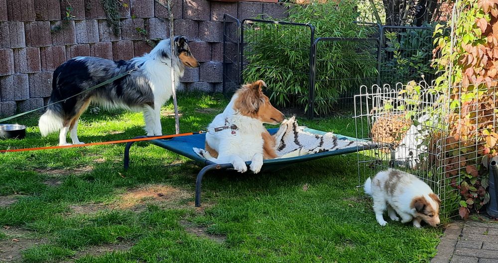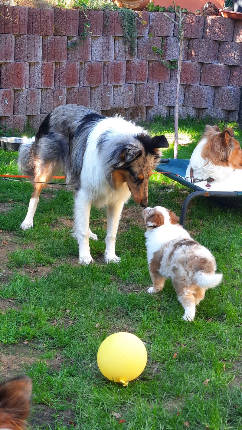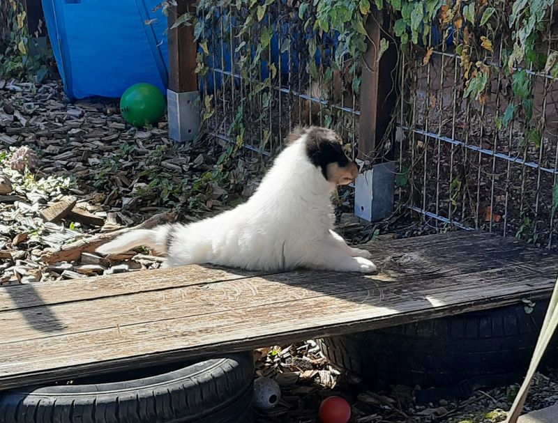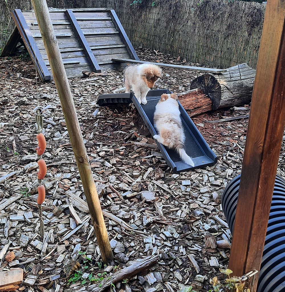 20.09.25 (41 Tage alt, fast 5 Wochen) Was soll ich sagen, … mich kriegt keiner ein 😉 :-P. Also hier kommt Silas, der große Weiße 😀 Wollte euch doch berichten was wir hier alles so durchmachen 😀 Also, den kleinen Garten oben hatten wir ja nun ein paar Tage in Beschlag genommen auch unser Futter inclusive Milchbar gab es draußen. Auch die großen Hunde waren bei uns die süße Linny hat super mit uns gespielt und auch IHREN Knochen geteilt. 🙂 Da war auch viel los, es kamen immer mal wieder neugierige Leute die dann streicheln wollten und so allerlei wissen wollten. Frauli ist ja da, die kann das regeln. aber heute war der Knaller wir sind in den großen Outdoor Garten gekommen. Das ist toll da und ganz viele Knochen gabs und unsere geliebe Geräusche Kiste war auch da. Was will man mehr… naja wenn du so fragst… FUTTER wäre nicht schlecht. 😀
