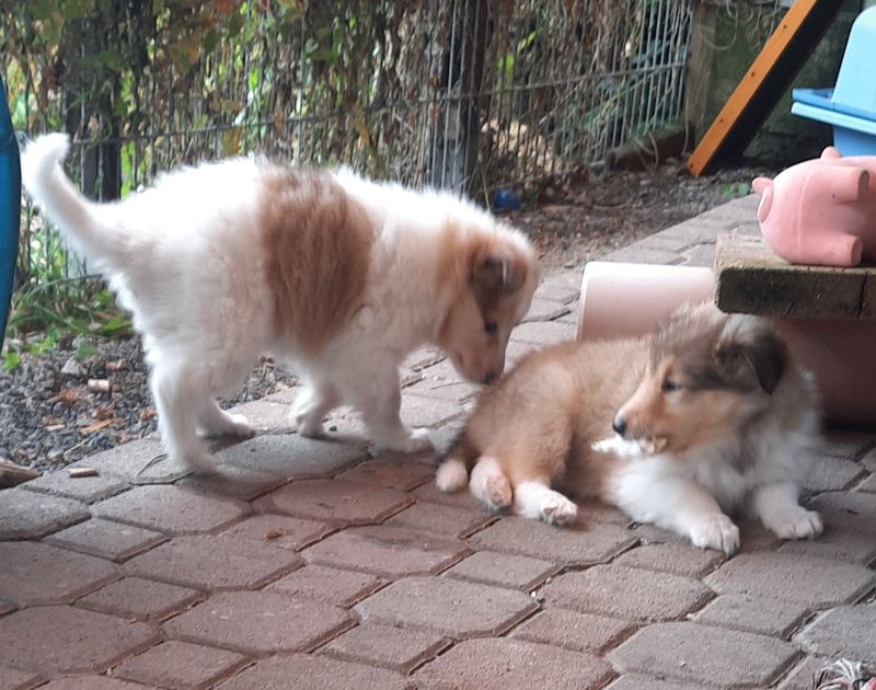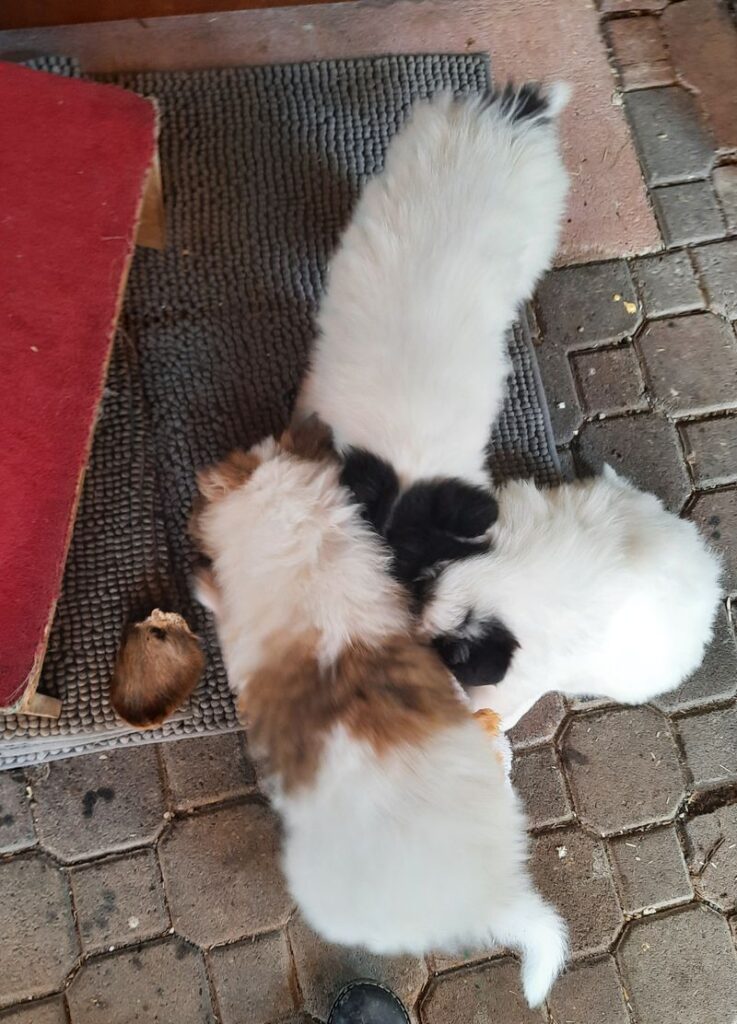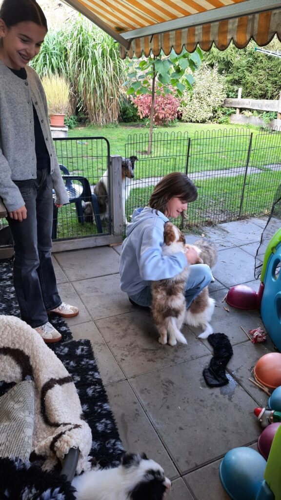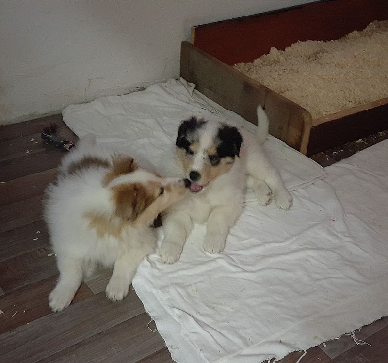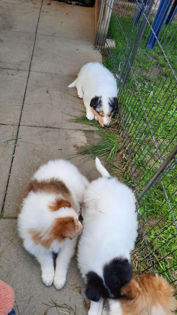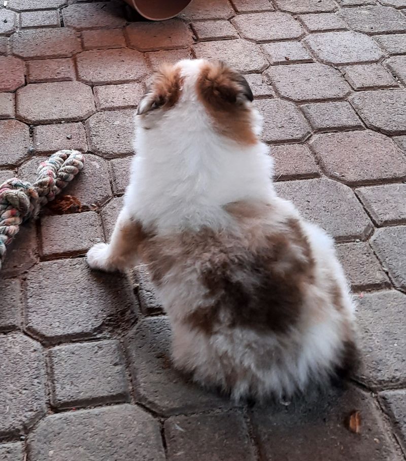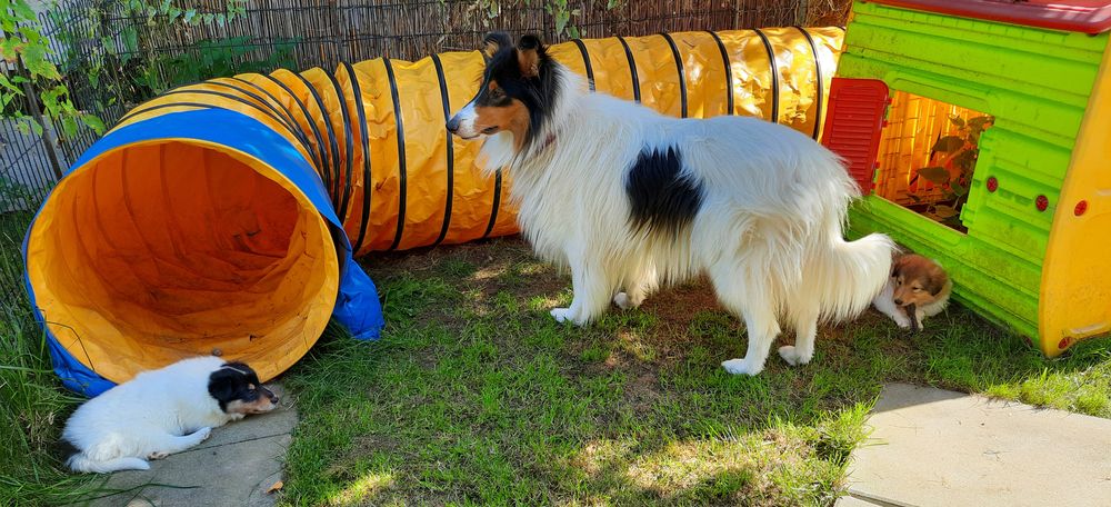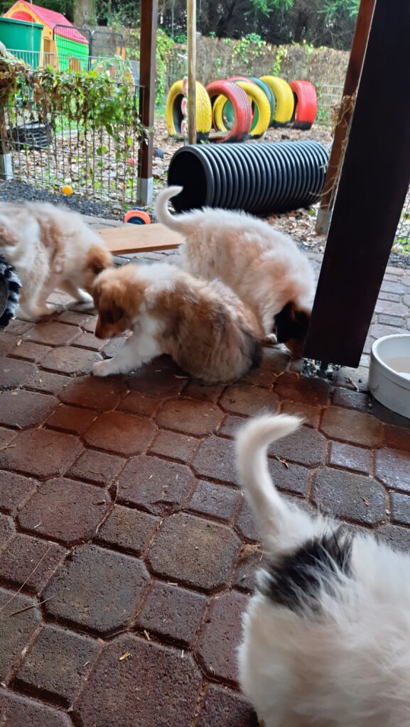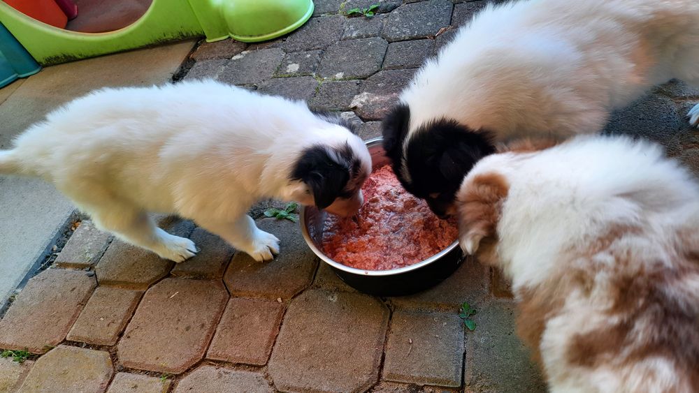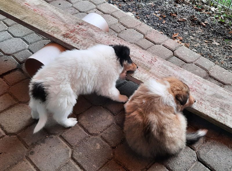 20.09.25 (41 Tage alt, fast 5 Wochen) Was soll ich sagen, … mich kriegt keiner ein 😉 :-P. Also hier kommt Silas, der große Weiße 😀 Wollte euch doch berichten was wir hier alles so durchmachen 😀 Also, den kleinen Garten oben hatten wir ja nun ein paar Tage in Beschlag genommen auch unser Futter inclusive Milchbar gab es draußen. Auch die großen Hunde waren bei uns die süße Linny hat super mit uns gespielt und auch IHREN Knochen geteilt. 🙂 Da war auch viel los, es kamen immer mal wieder neugierige Leute die dann streicheln wollten und so allerlei wissen wollten. Frauli ist ja da, die kann das regeln. aber heute war der Knaller wir sind in den großen Outdoor Garten gekommen. Das ist toll da und ganz viele Knochen gabs und unsere geliebe Geräusche Kiste war auch da. Was will man mehr… naja wenn du so fragst… FUTTER wäre nicht schlecht. 😀