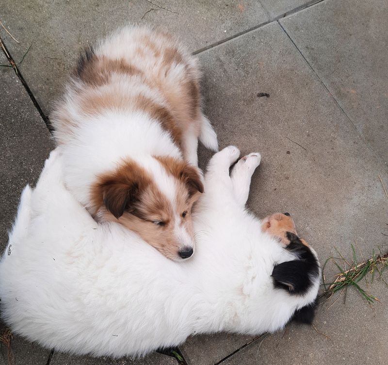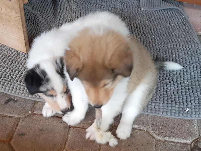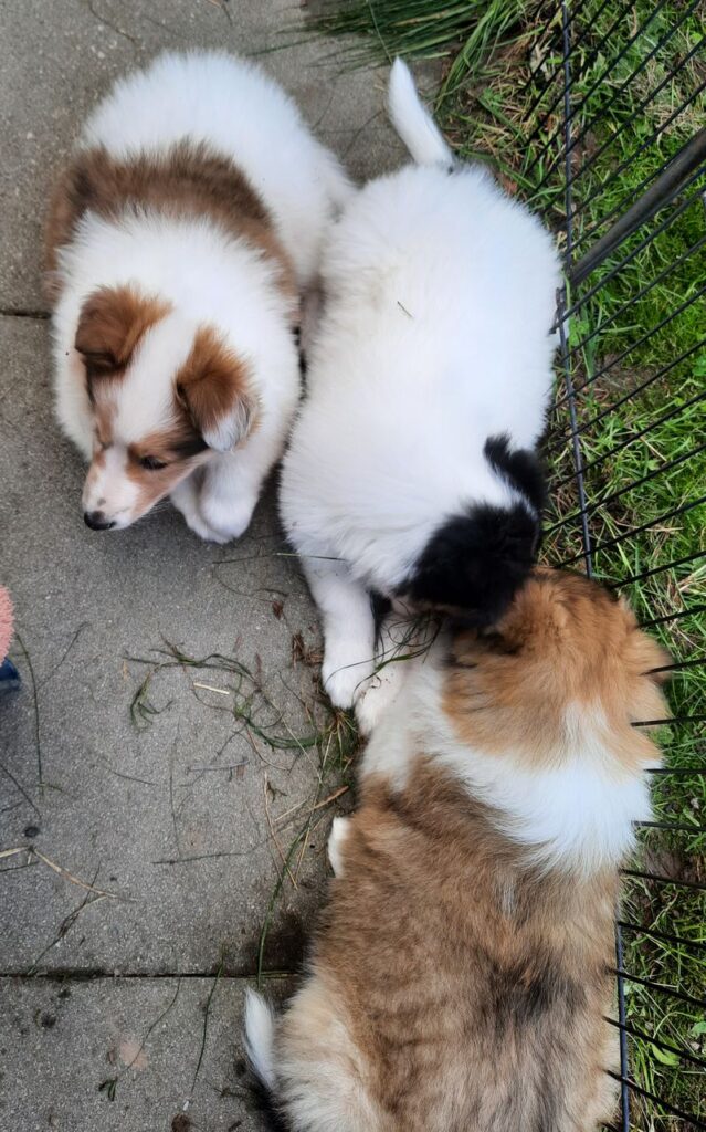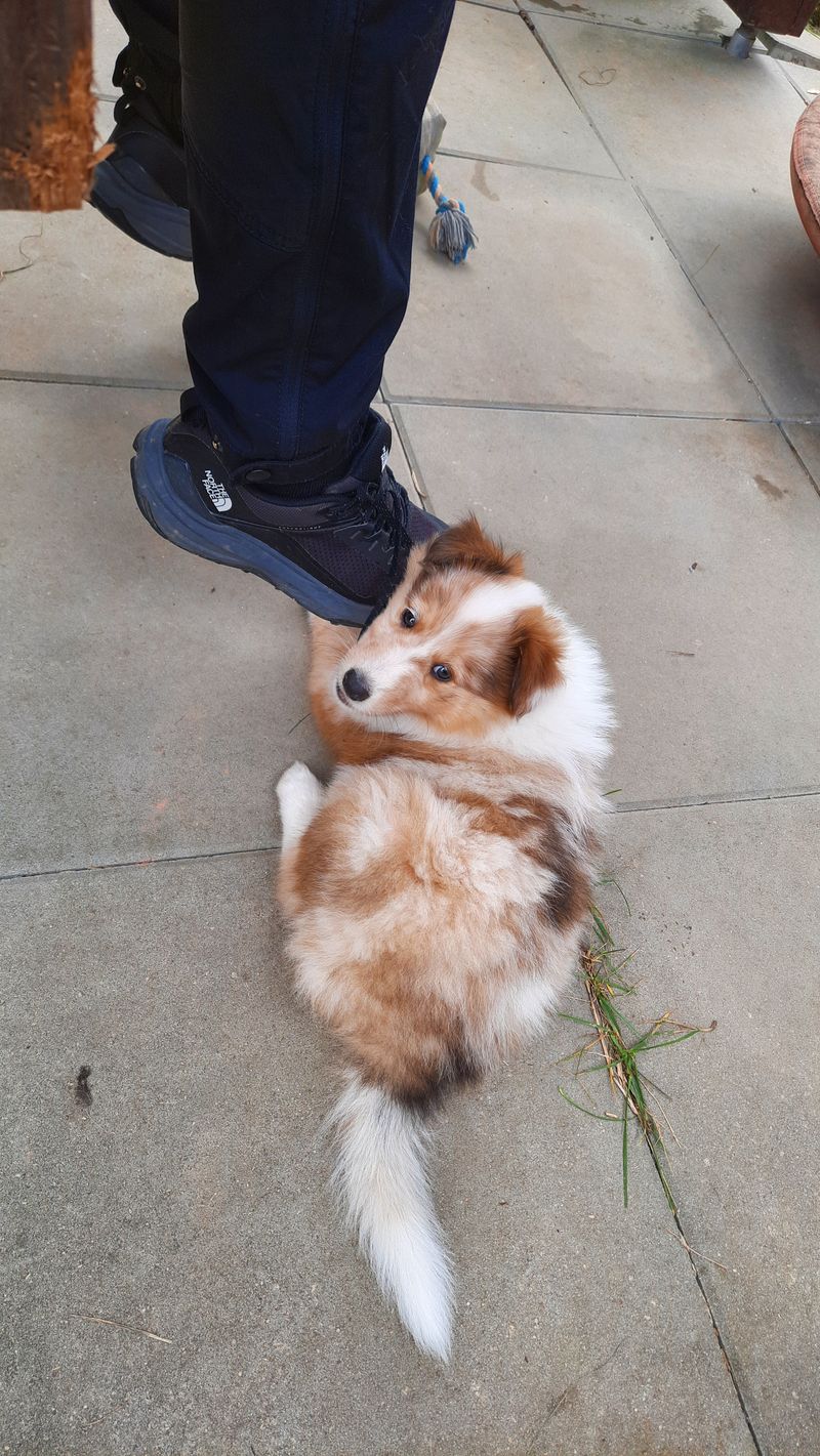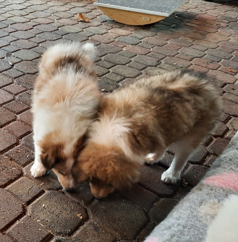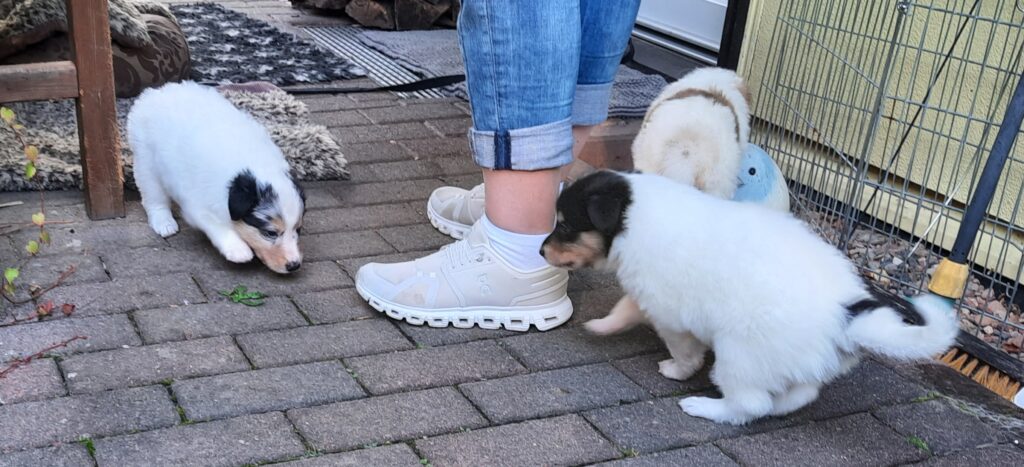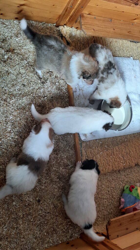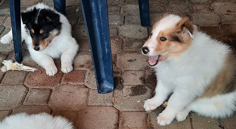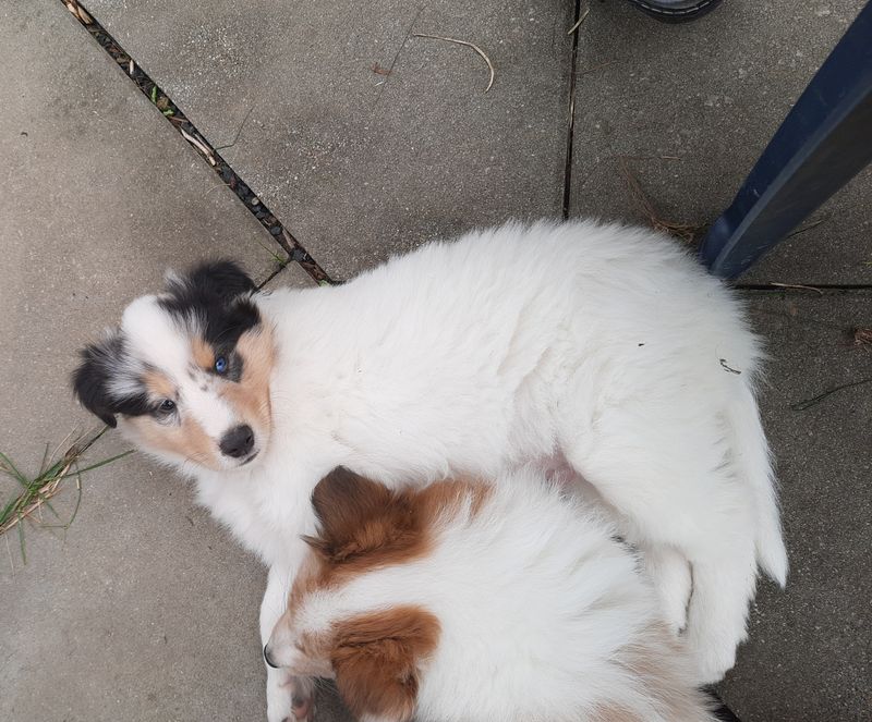 20.09.25 (41 Tage alt, fast 5 Wochen) Was soll ich sagen, … mich kriegt keiner ein 😉 :-P. Also hier kommt Silas, der große Weiße 😀 Wollte euch doch berichten was wir hier alles so durchmachen 😀 Also, den kleinen Garten oben hatten wir ja nun ein paar Tage in Beschlag genommen auch unser Futter inclusive Milchbar gab es draußen. Auch die großen Hunde waren bei uns die süße Linny hat super mit uns gespielt und auch IHREN Knochen geteilt. 🙂 Da war auch viel los, es kamen immer mal wieder neugierige Leute die dann streicheln wollten und so allerlei wissen wollten. Frauli ist ja da, die kann das regeln. aber heute war der Knaller wir sind in den großen Outdoor Garten gekommen. Das ist toll da und ganz viele Knochen gabs und unsere geliebe Geräusche Kiste war auch da. Was will man mehr… naja wenn du so fragst… FUTTER wäre nicht schlecht. 😀