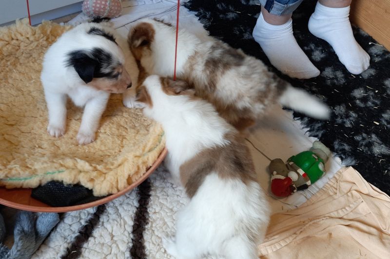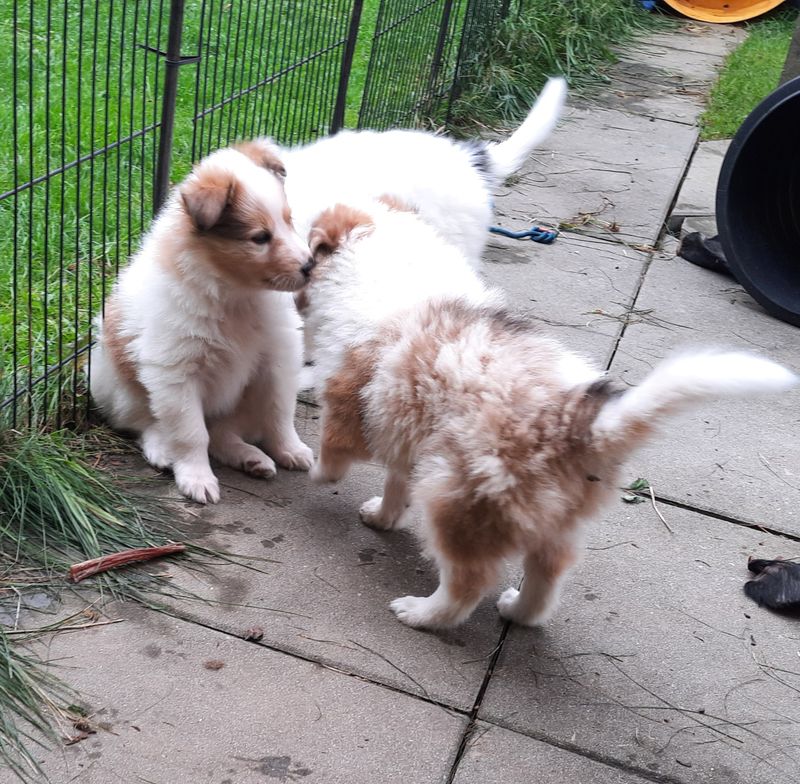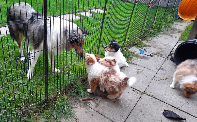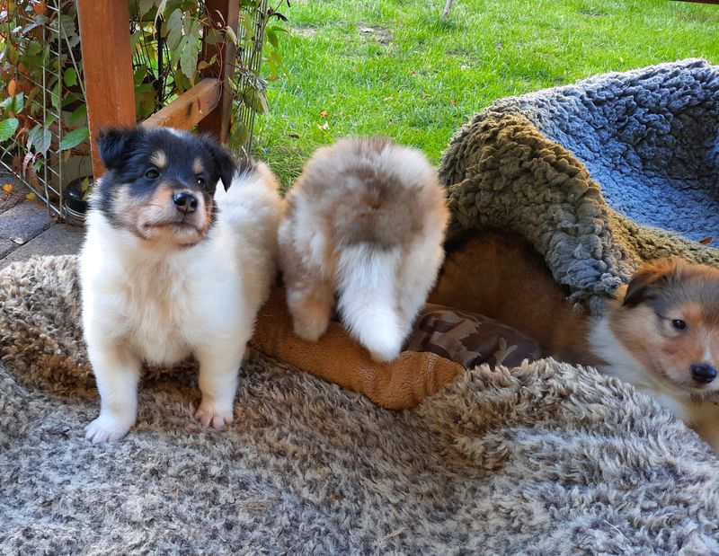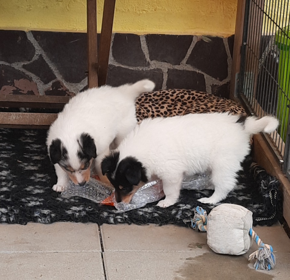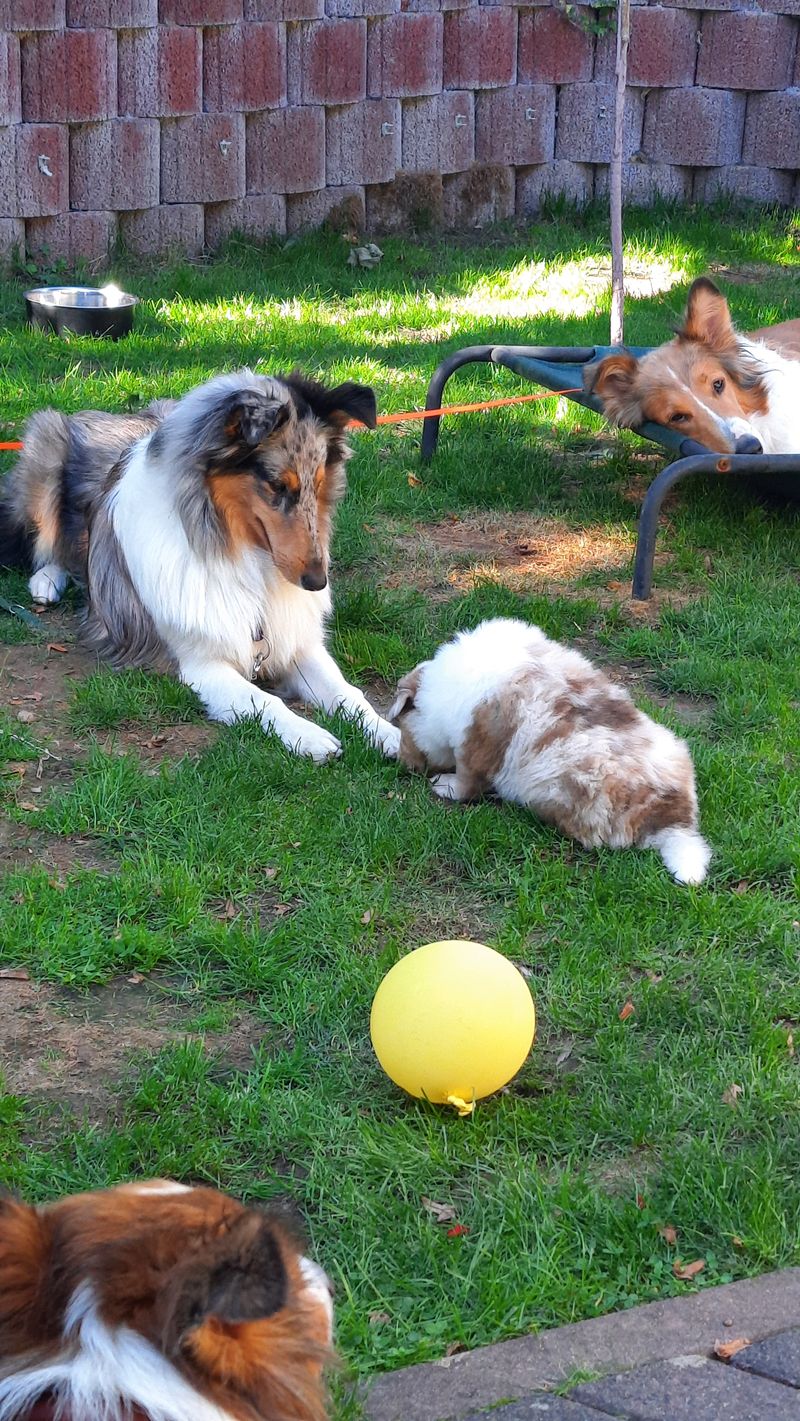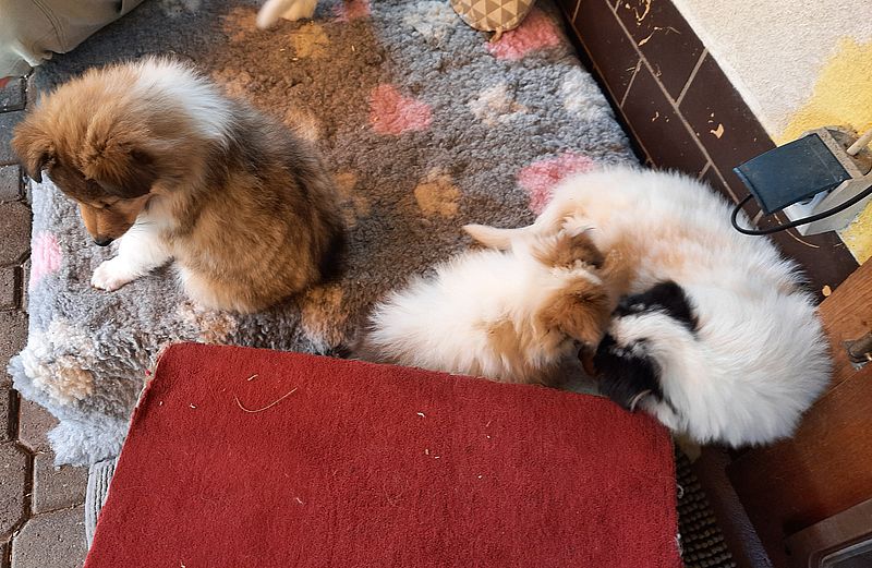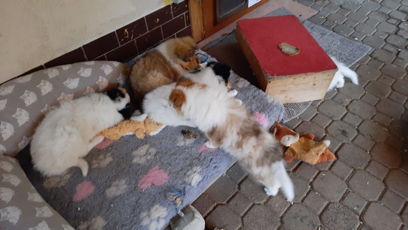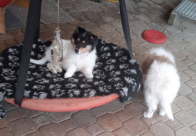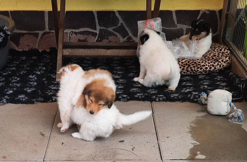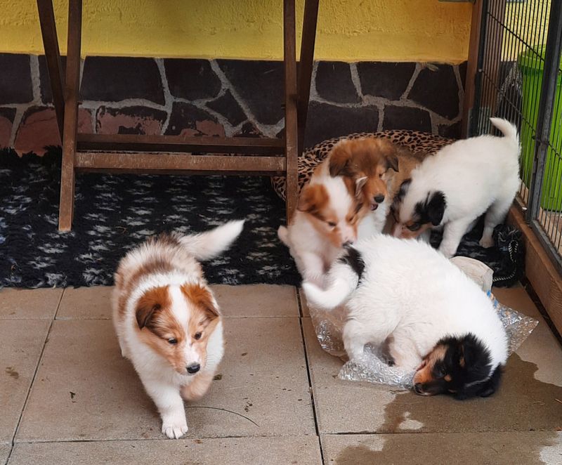 15.09.25 ( 36 Tage alt, 4 Wochen ) Huhu ich bin´s wieder der Silas, hat mich noch keiner überholt. 😉 Wollte euch doch von unseren letzten Tagen berichten, hier ist ja ziemlich viel passiert. Angefangen von unserer Toilette, die sich seltsamerweise in Heu verwandelt hat und dann am nächsten Tag wurde unsere Box geöffnet, das war vielleicht aufregend, wie ihr ja gesehen habt hatte ich gehörigen Respekt davor, die anderen sind ja gleich raus ins Getümmel 🙂 Dann hatten wir Besuch von Fraulis Freudin, die kommt ja öfter zum Knuddeln und am nächsten Tag waren hier ganz liebe Leute für Joey. Aber die hatten ihr Schaff, denn Yuki wollte unbedingt ihr Hund werden. Sie hat sich die ganzen 3,5 Stunden nicht von den Leuten wegbewegt und war dann abends im Koma 😀 Naja, man kann nicht alles haben. Am nächsten Tag kam dann Silas Frauli, sie hat ja unseren Halbbruder/Onkel Keanu schon von Mama. Tja, und im Garten waren auch schon fast alle. Aber so toll fanden wir es da nicht, weil es so windig war. So, nun zeig ich euch noch die Fotos dazu und sage bis demnächst, vielleicht wieder mit mir euer Silas . 😉