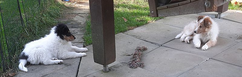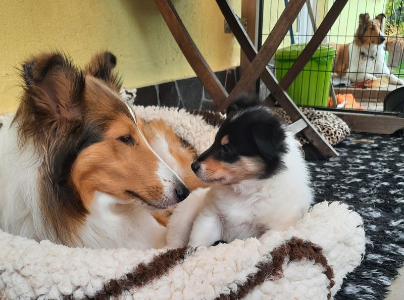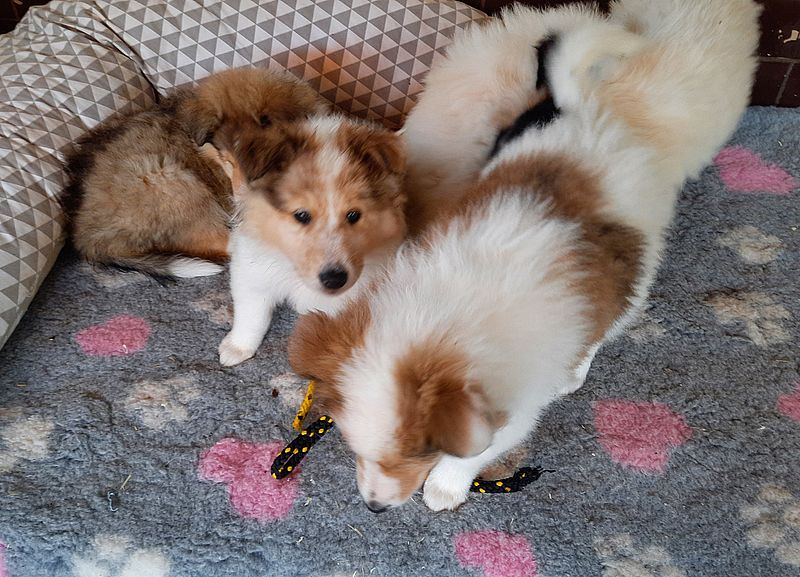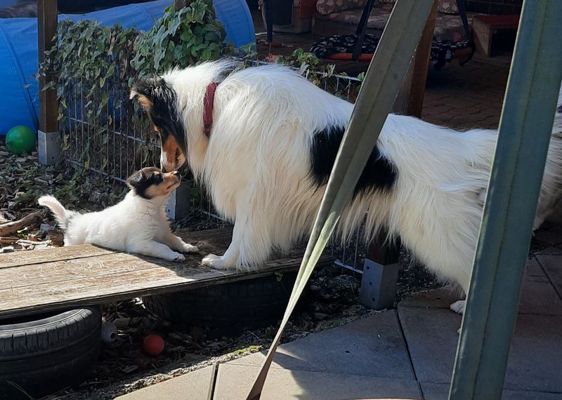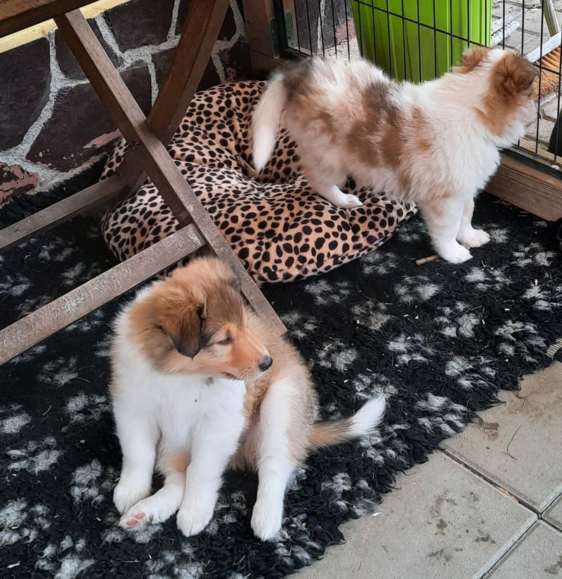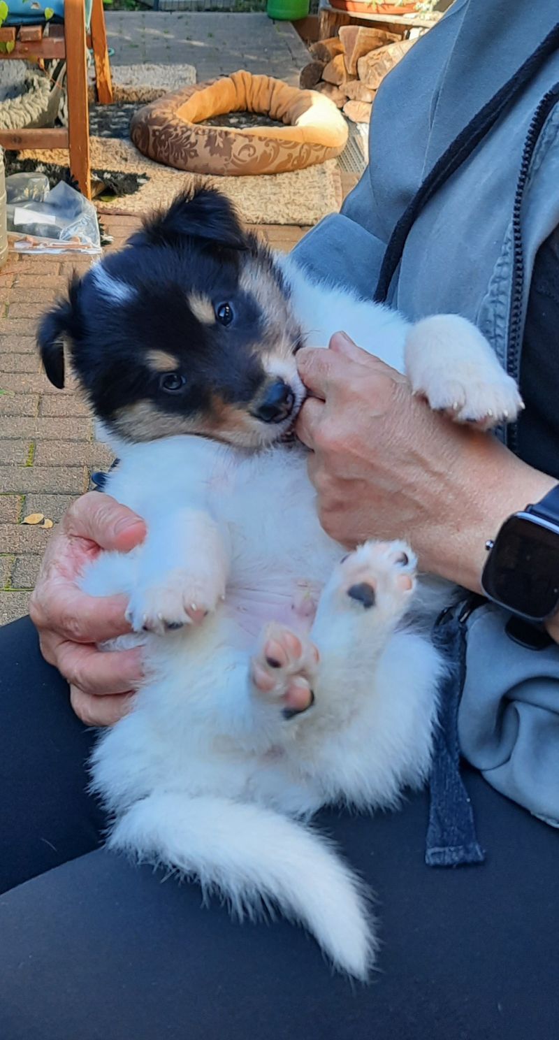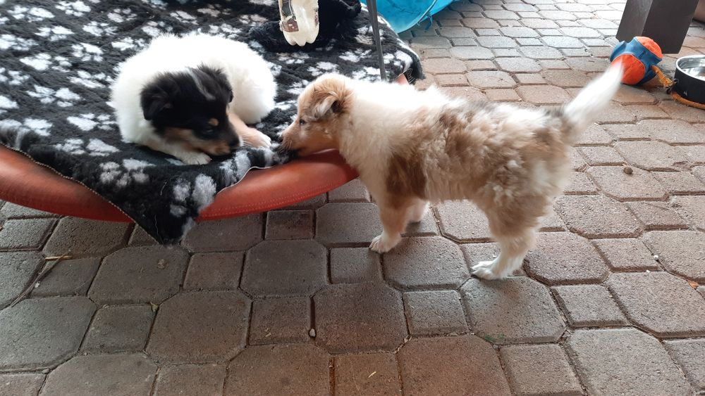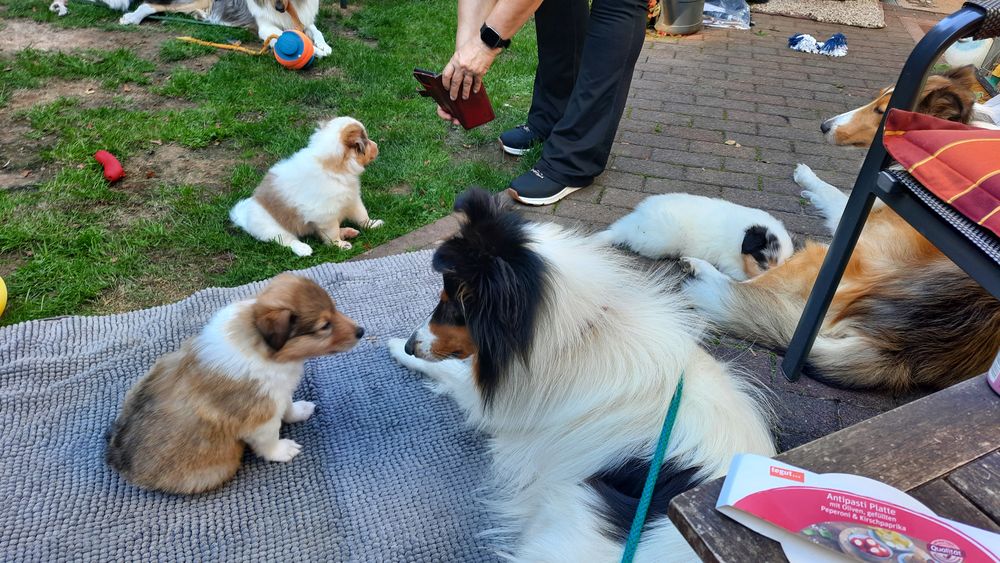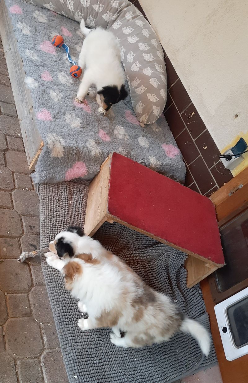 15.09.25 ( 36 Tage alt, 4 Wochen ) Huhu ich bin´s wieder der Silas, hat mich noch keiner überholt. 😉 Wollte euch doch von unseren letzten Tagen berichten, hier ist ja ziemlich viel passiert. Angefangen von unserer Toilette, die sich seltsamerweise in Heu verwandelt hat und dann am nächsten Tag wurde unsere Box geöffnet, das war vielleicht aufregend, wie ihr ja gesehen habt hatte ich gehörigen Respekt davor, die anderen sind ja gleich raus ins Getümmel 🙂 Dann hatten wir Besuch von Fraulis Freudin, die kommt ja öfter zum Knuddeln und am nächsten Tag waren hier ganz liebe Leute für Joey. Aber die hatten ihr Schaff, denn Yuki wollte unbedingt ihr Hund werden. Sie hat sich die ganzen 3,5 Stunden nicht von den Leuten wegbewegt und war dann abends im Koma 😀 Naja, man kann nicht alles haben. Am nächsten Tag kam dann Silas Frauli, sie hat ja unseren Halbbruder/Onkel Keanu schon von Mama. Tja, und im Garten waren auch schon fast alle. Aber so toll fanden wir es da nicht, weil es so windig war. So, nun zeig ich euch noch die Fotos dazu und sage bis demnächst, vielleicht wieder mit mir euer Silas . 😉