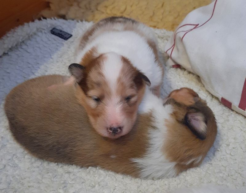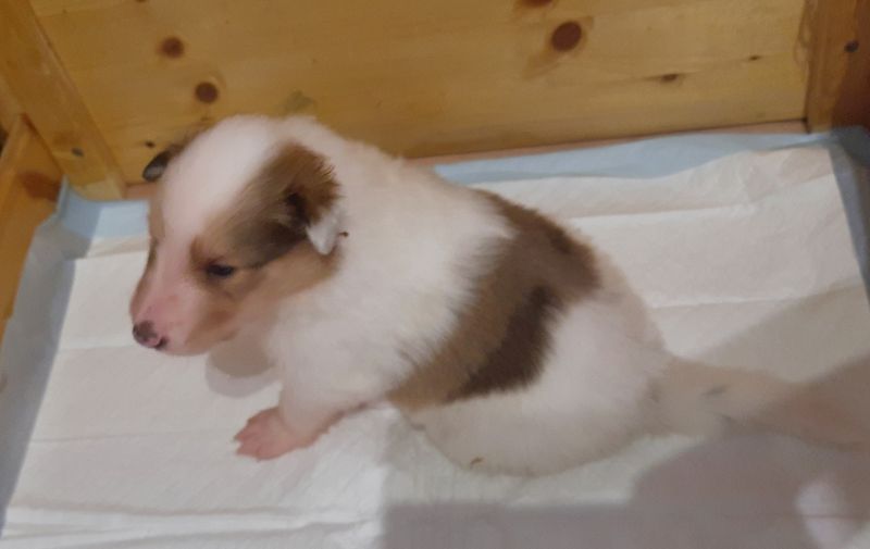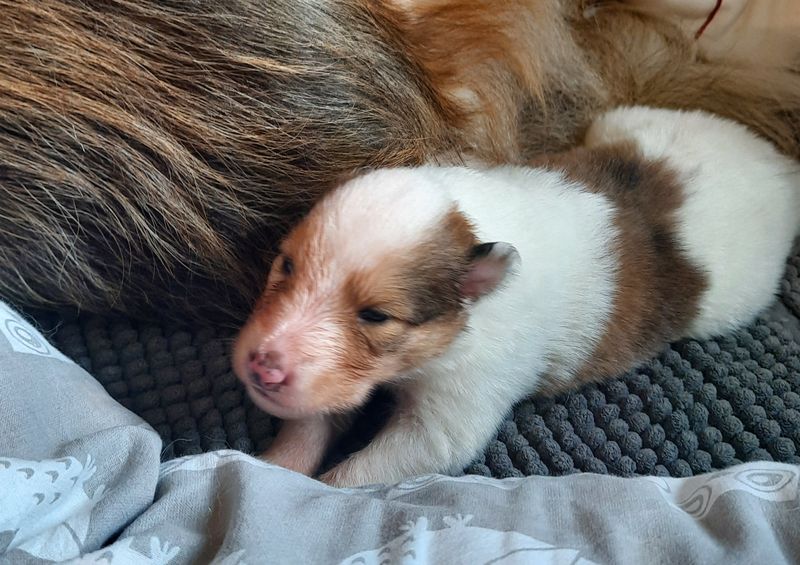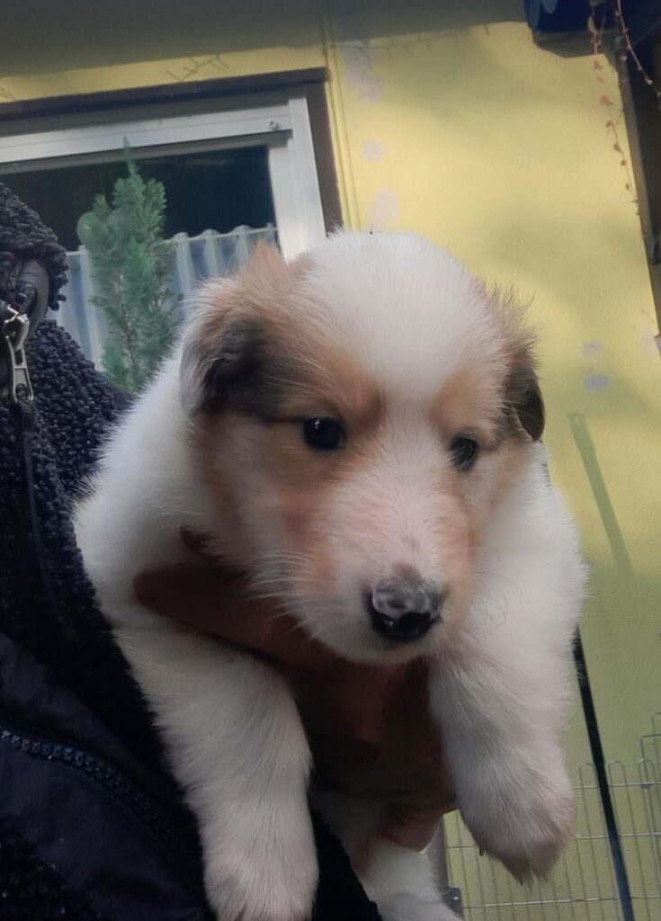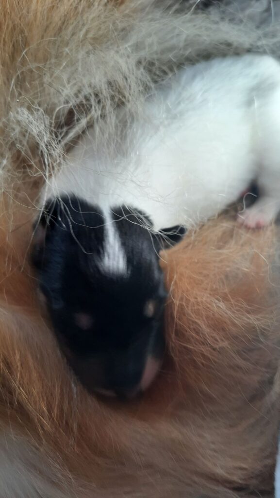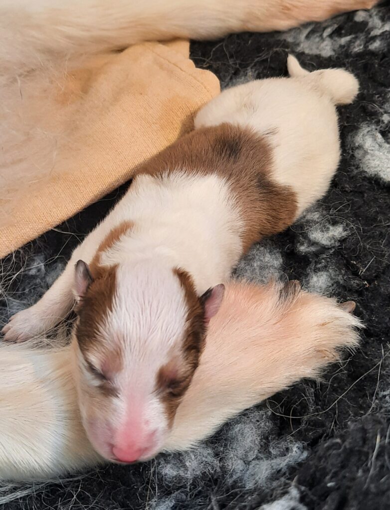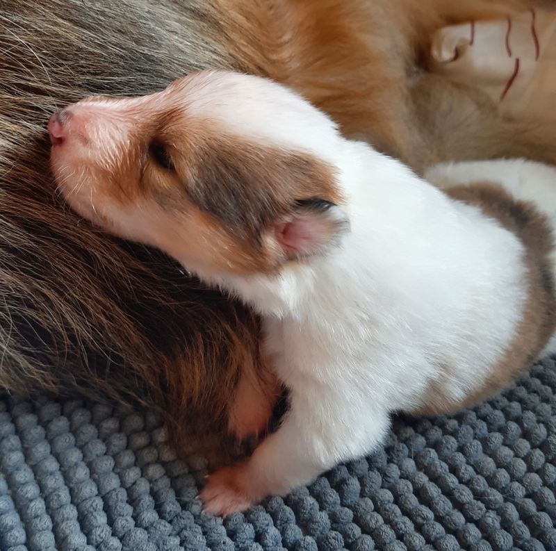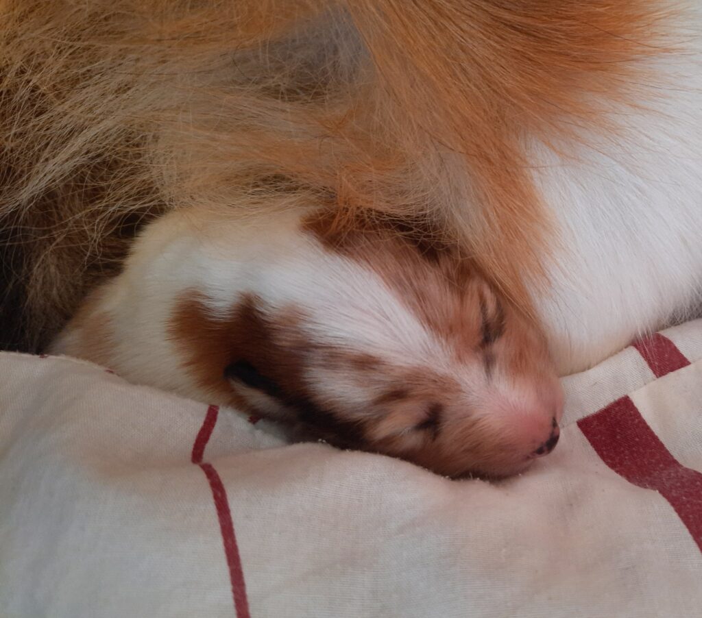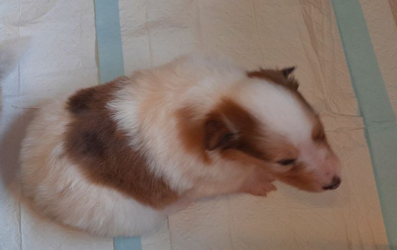 „3. Welpe “ Only you „Joey“, Dark-Sable/White 9:30 Uhr Rüde 386 g (Löwe- Aszendent Löwe) und im chinesischen ein Holz Schlange ausgezogen