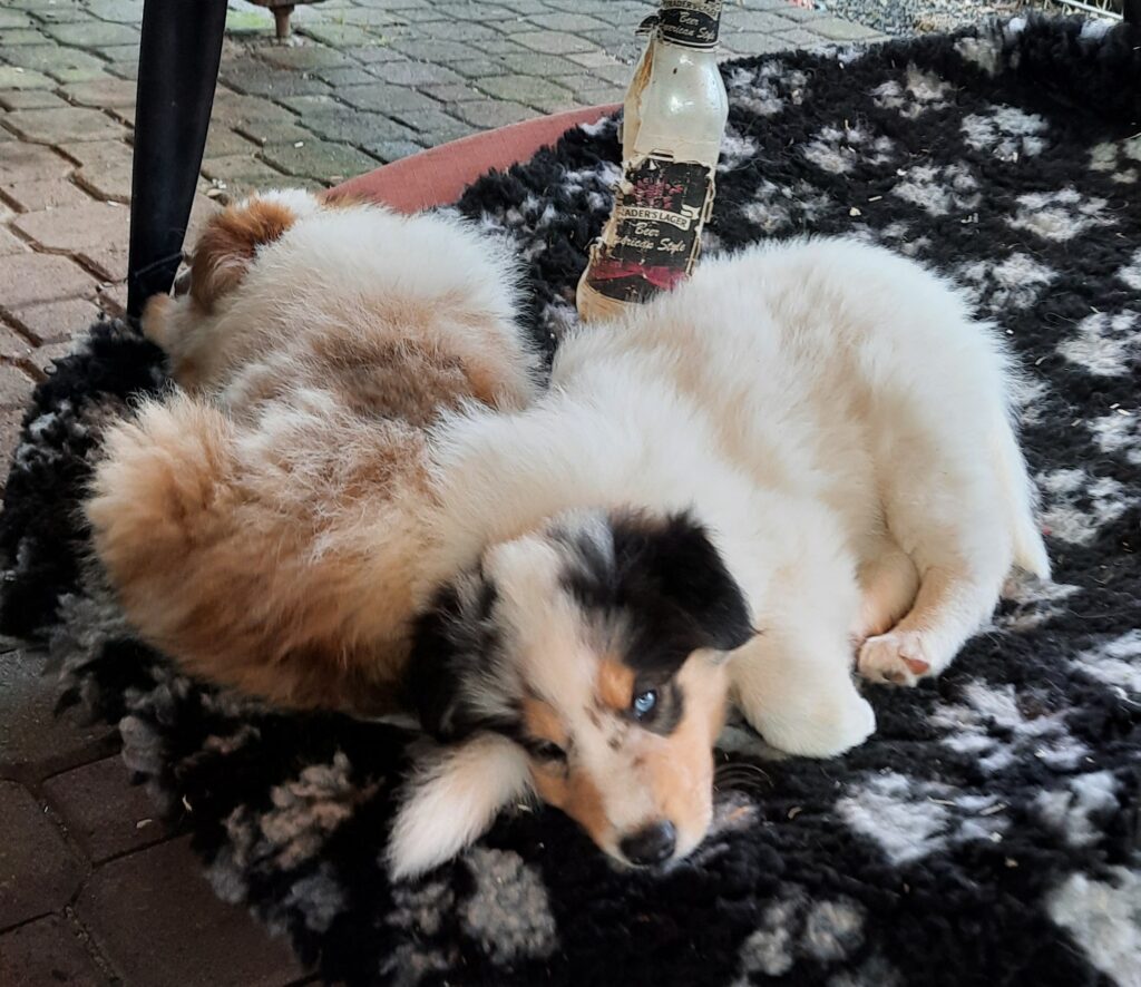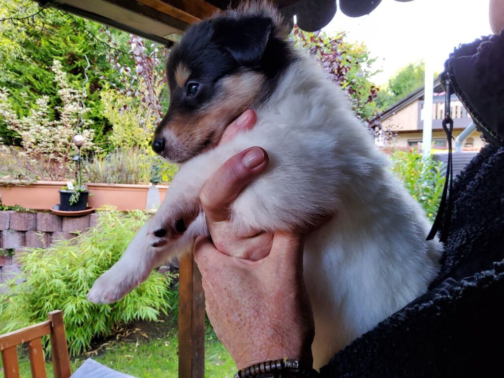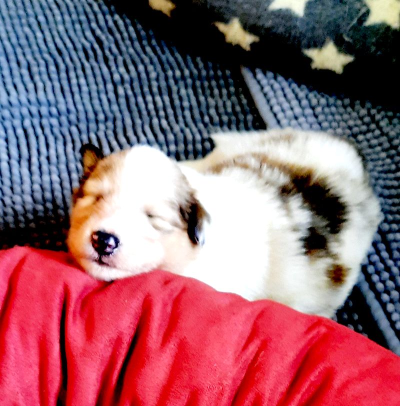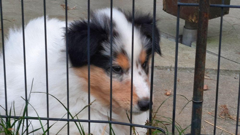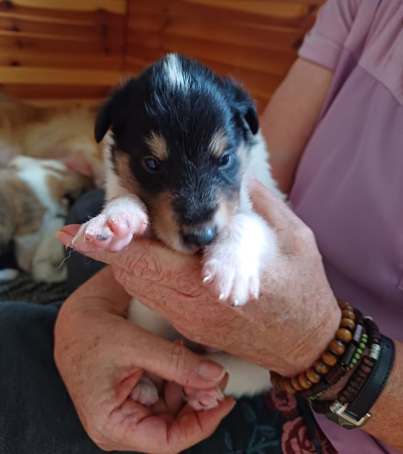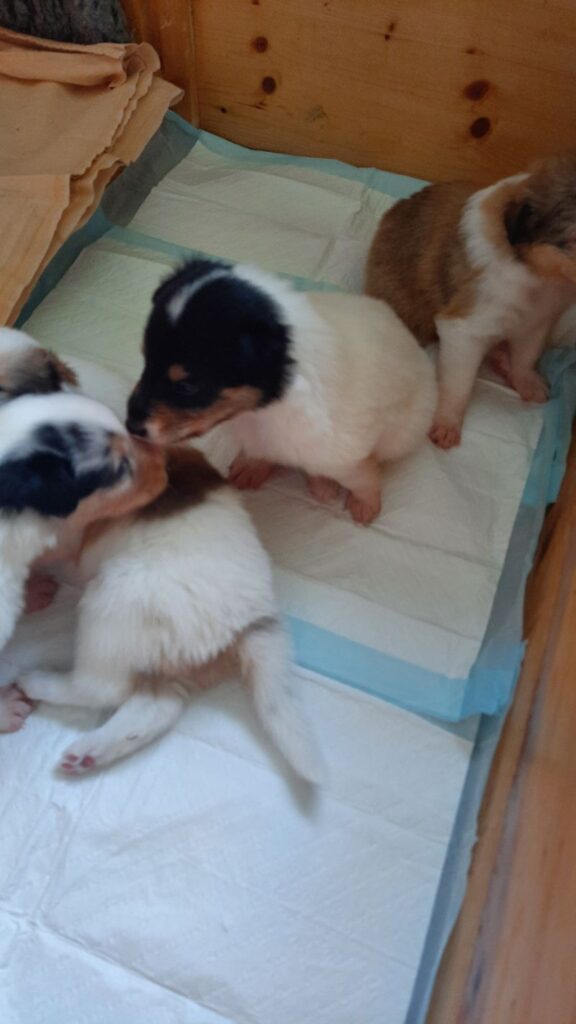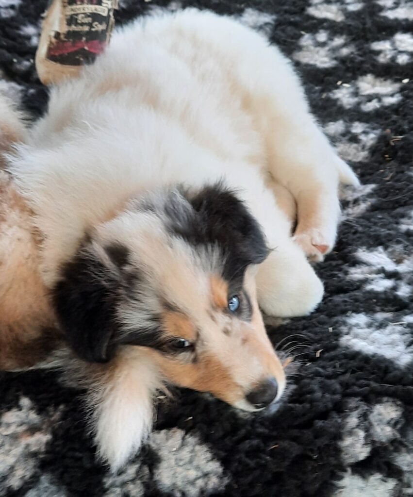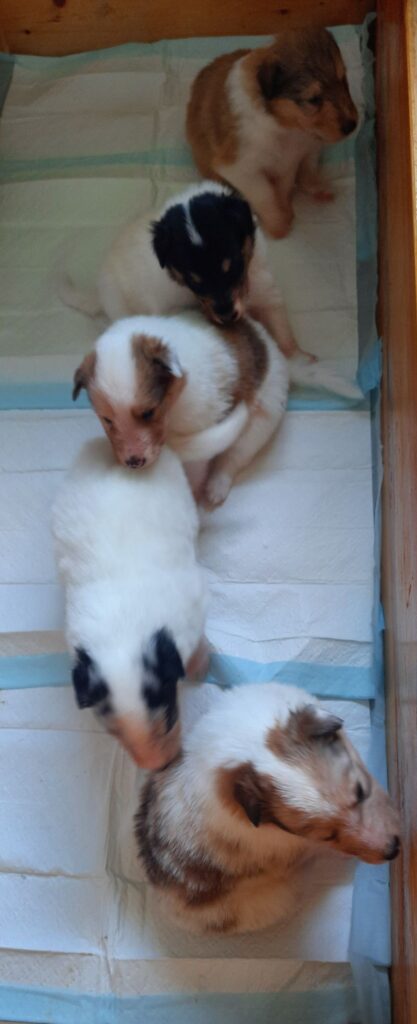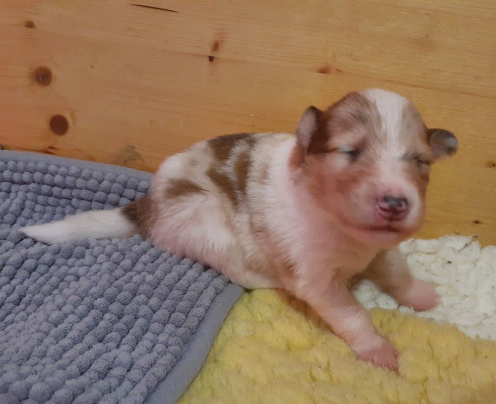Es ist ein wirklich gelungener Wurf, alle Farben sind vertreten. Die da wären: 1/0 CHW- Blue-Merle, 1/0 CHW Trico Marken, 1/0 Dark-Sable /White, 0/1 CHW Sable-Merle und 0/1 Sable-Merle/ White/Harlekin. 😀