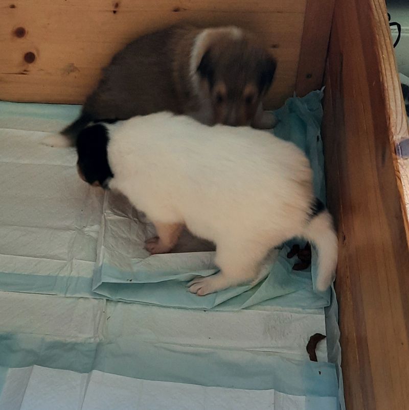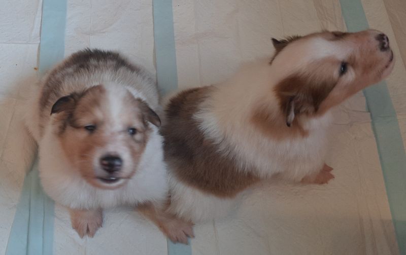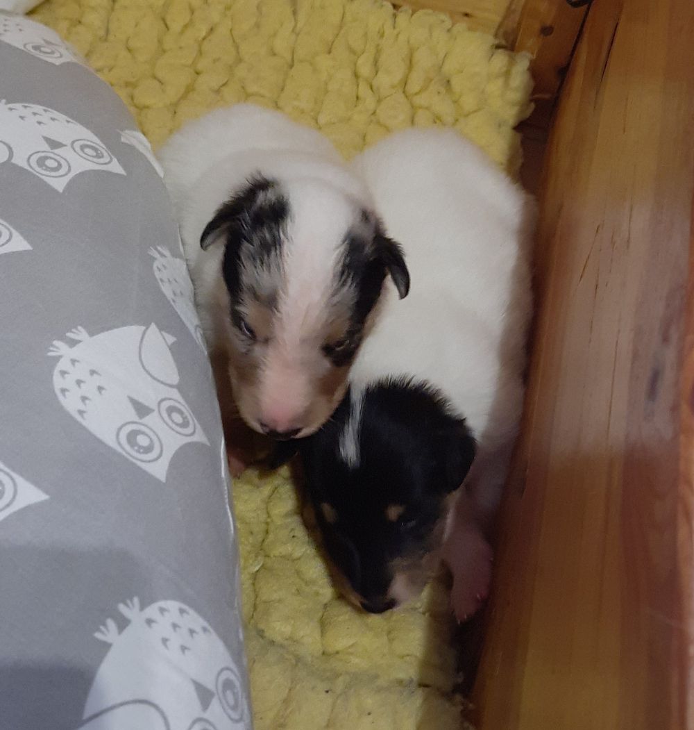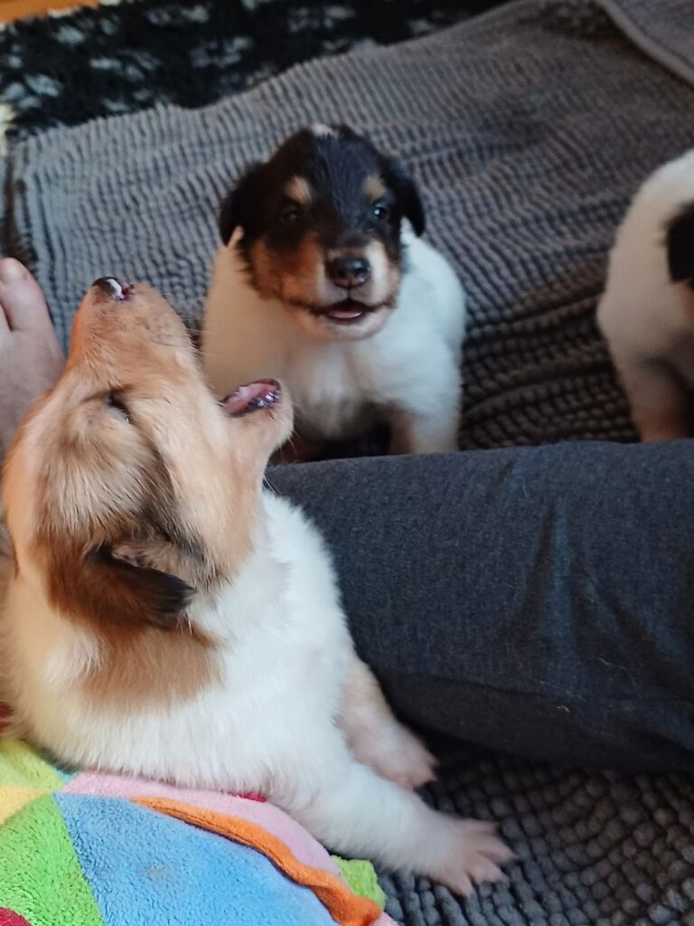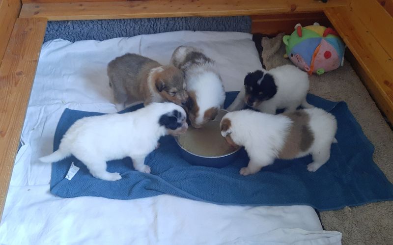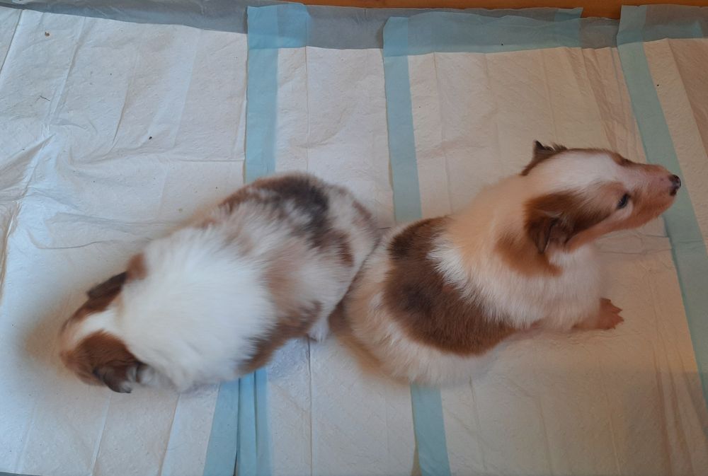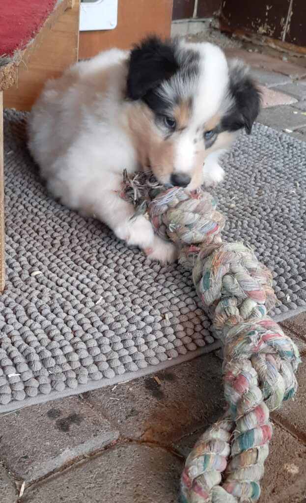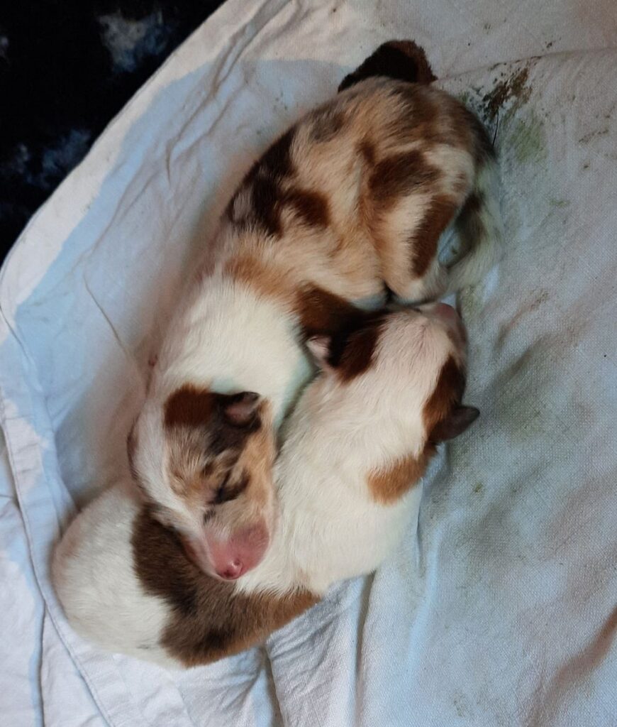 Es ist ein wirklich gelungener Wurf, alle Farben sind vertreten. Die da wären: 1/0 CHW- Blue-Merle, 1/0 CHW Trico Marken, 1/0 Dark-Sable /White, 0/1 CHW Sable-Merle und 0/1 Sable-Merle/ White/Harlekin. 😀