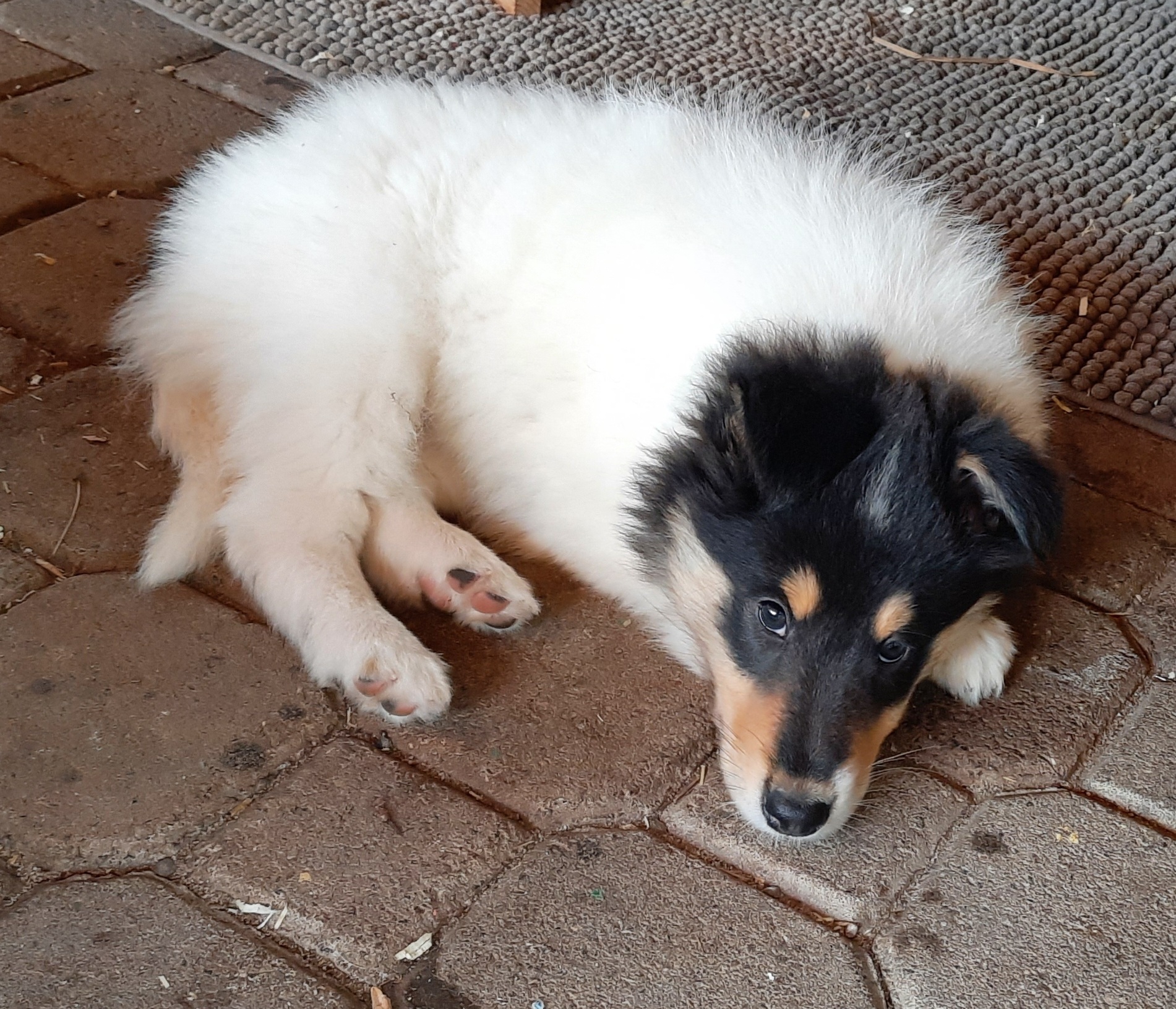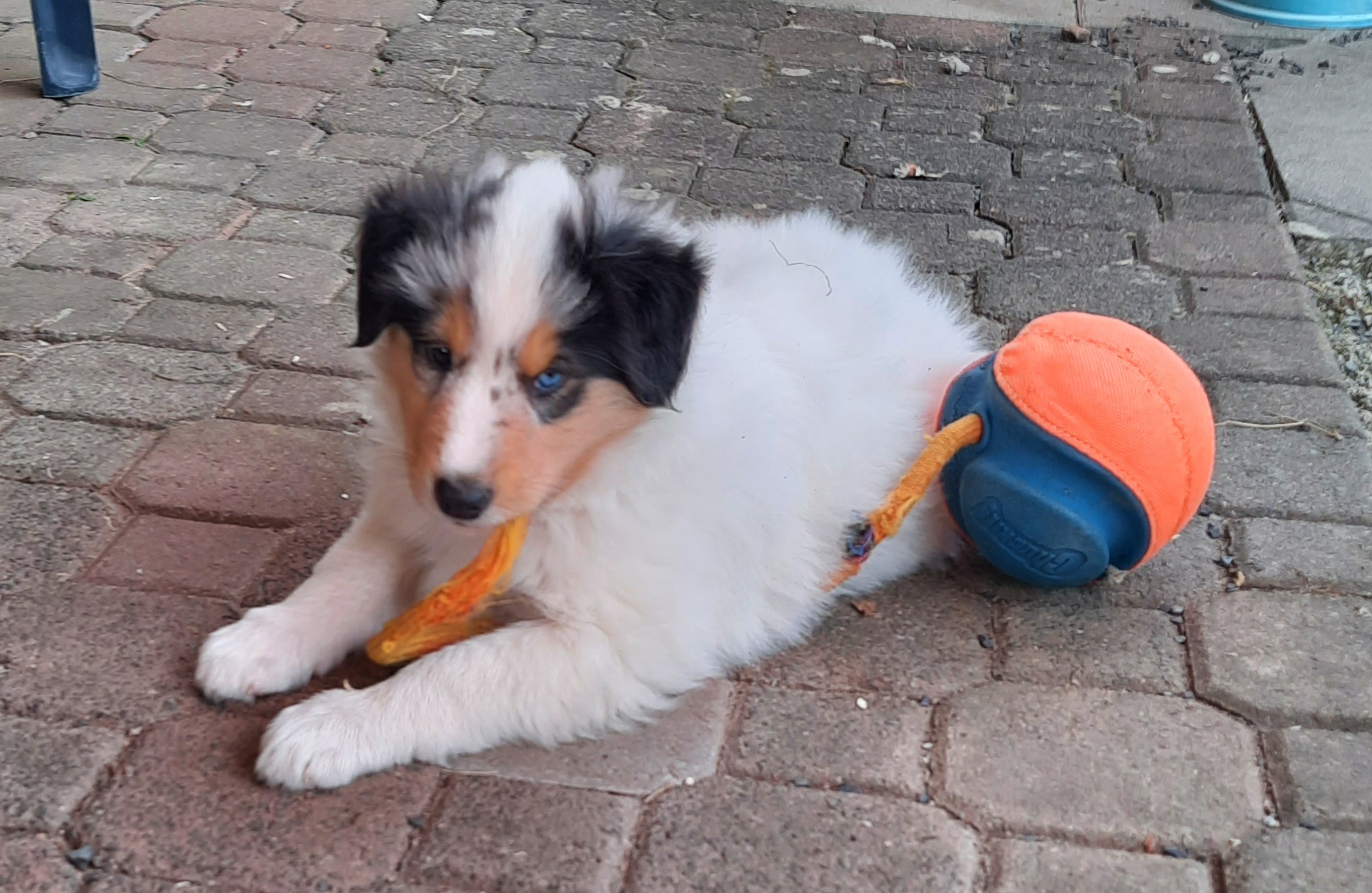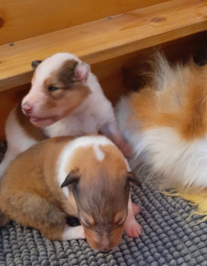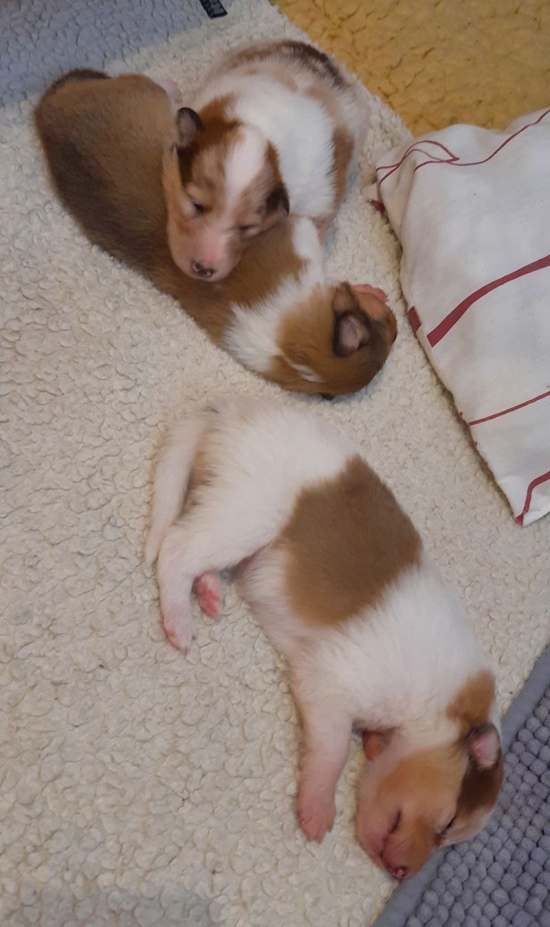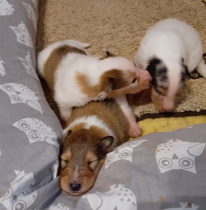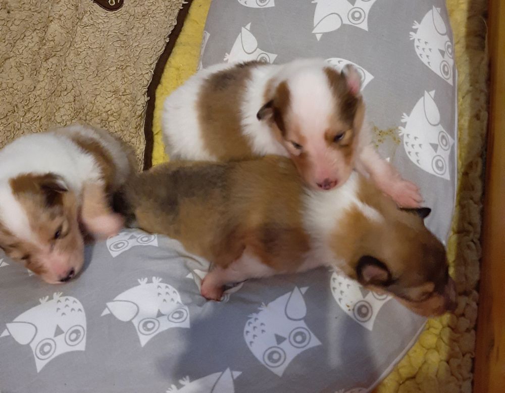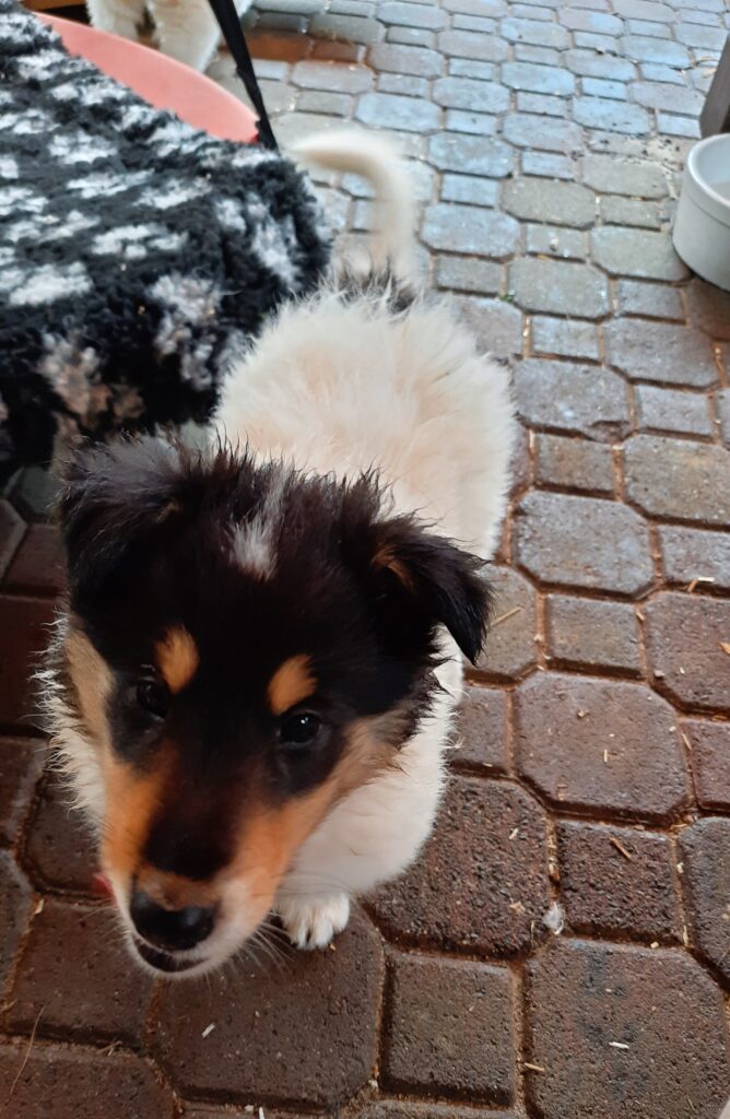 Es ist ein wirklich gelungener Wurf, alle Farben sind vertreten. Die da wären: 1/0 CHW- Blue-Merle, 1/0 CHW Trico Marken, 1/0 Dark-Sable /White, 0/1 CHW Sable-Merle und 0/1 Sable-Merle/ White/Harlekin. 😀