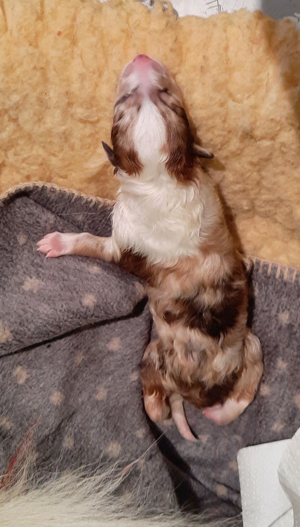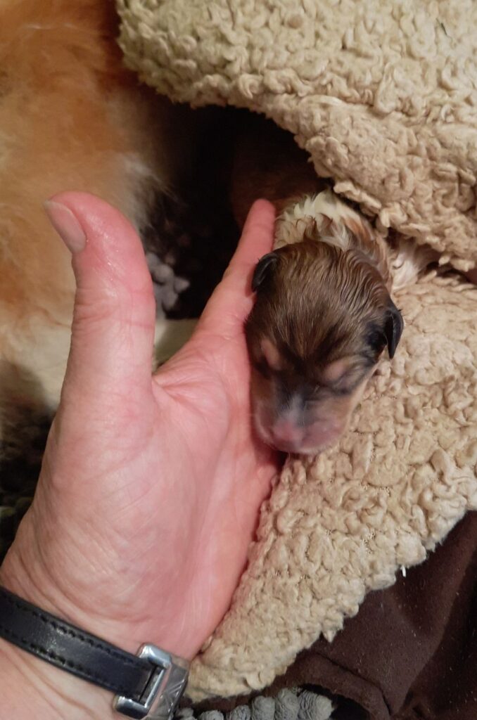 „4.Welpe“ „Oyuki “ (jap. Schneeblume) CHW- Sable-Merle 9:52 Uhr Hündin 382 g (Löwe- Aszendent Löwe) und im chinesischen Holz Schlange ausgezogen und heißt jetzt Hazel