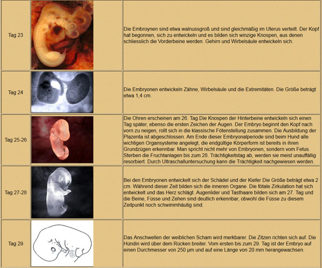 15.03.26 ( Tag 21 / 4. Woche ) Hi, Jana hier, mir geht es sehr gut und hänge seeeehr an Frauli um auch immer was abzustauben. 😉 Wir sind sehr viel Spazieren, da wir wohl den Winter nachholen wollen, wo wir eben nicht laufen konnten. Aber das macht Spaß. Nun rückt der Schalltermin immer näher und alle fragen, wann wir denn nun endlich gehen. 😀 Noch 4 mal müssen wir Schlafen gehen. Dann wißt ihr es alle ganz genau. Wir die Mina und ich wissen ja was los ist. Aber wir dürfen nix sagen. Aber wenn bei mir Krümel drin sind dann würden sie jetzt so weit sein. Guckst du hier: Vorgeburtliche Entwicklung der Welpen